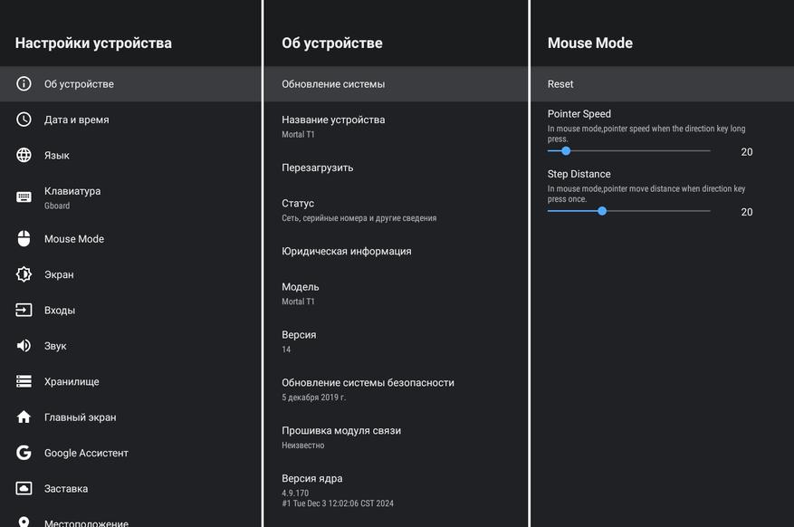 В настройках тоже все оформлено в «старом» стиле. Если зайти в информацию об устройстве, то сразу увидим явные несостыковки. Версия операционной системы указана как 14, однако установлено обновление систем безопасности от 2019 года. Т. е мы можем сделать заключение, что это система 2019 года. И по этому показателю у нас должен быть Android TV 10. Подтверждение этого я найду и в некоторых утилитах. По сути, нас второй раз уже обманывают. Ладно, посмотрим на некоторые параметры. Из полезного, можно настроить скорость работы виртуальной мышки.