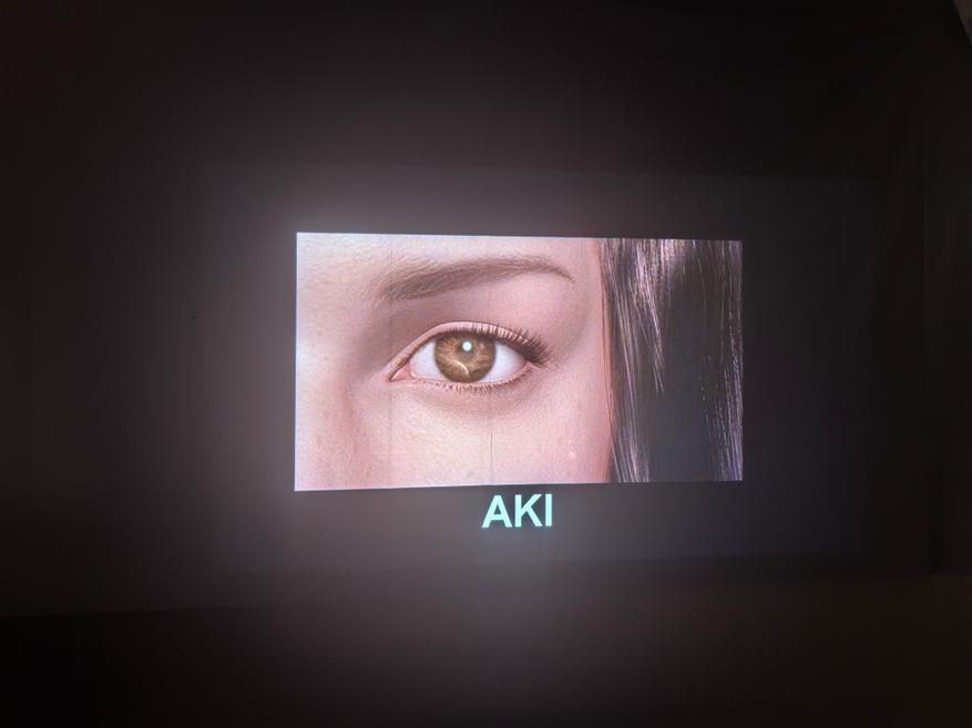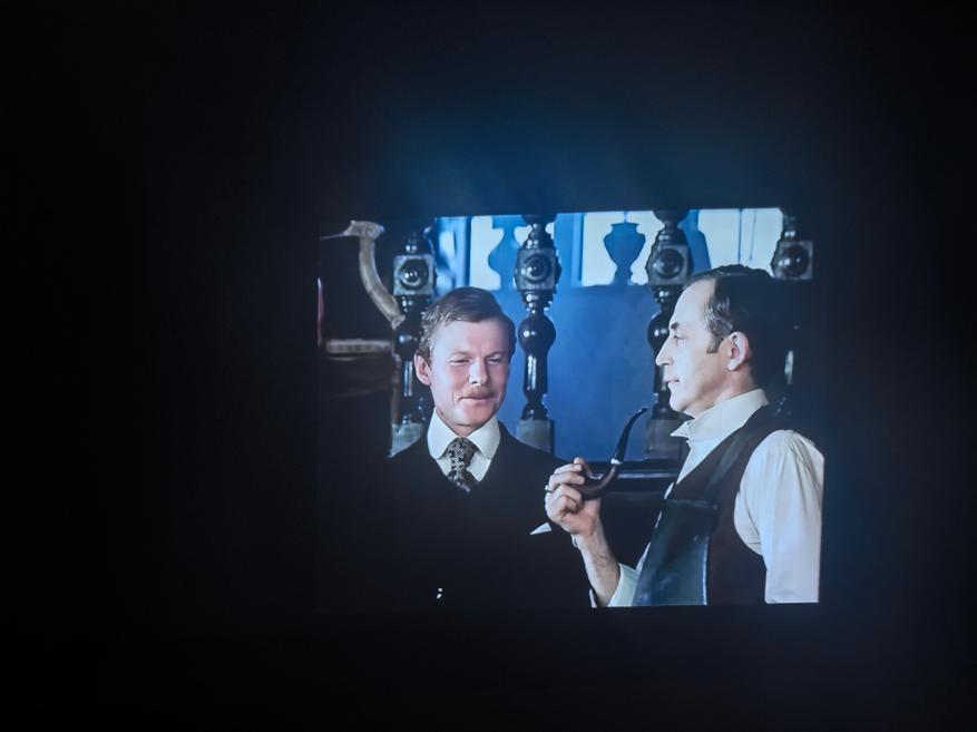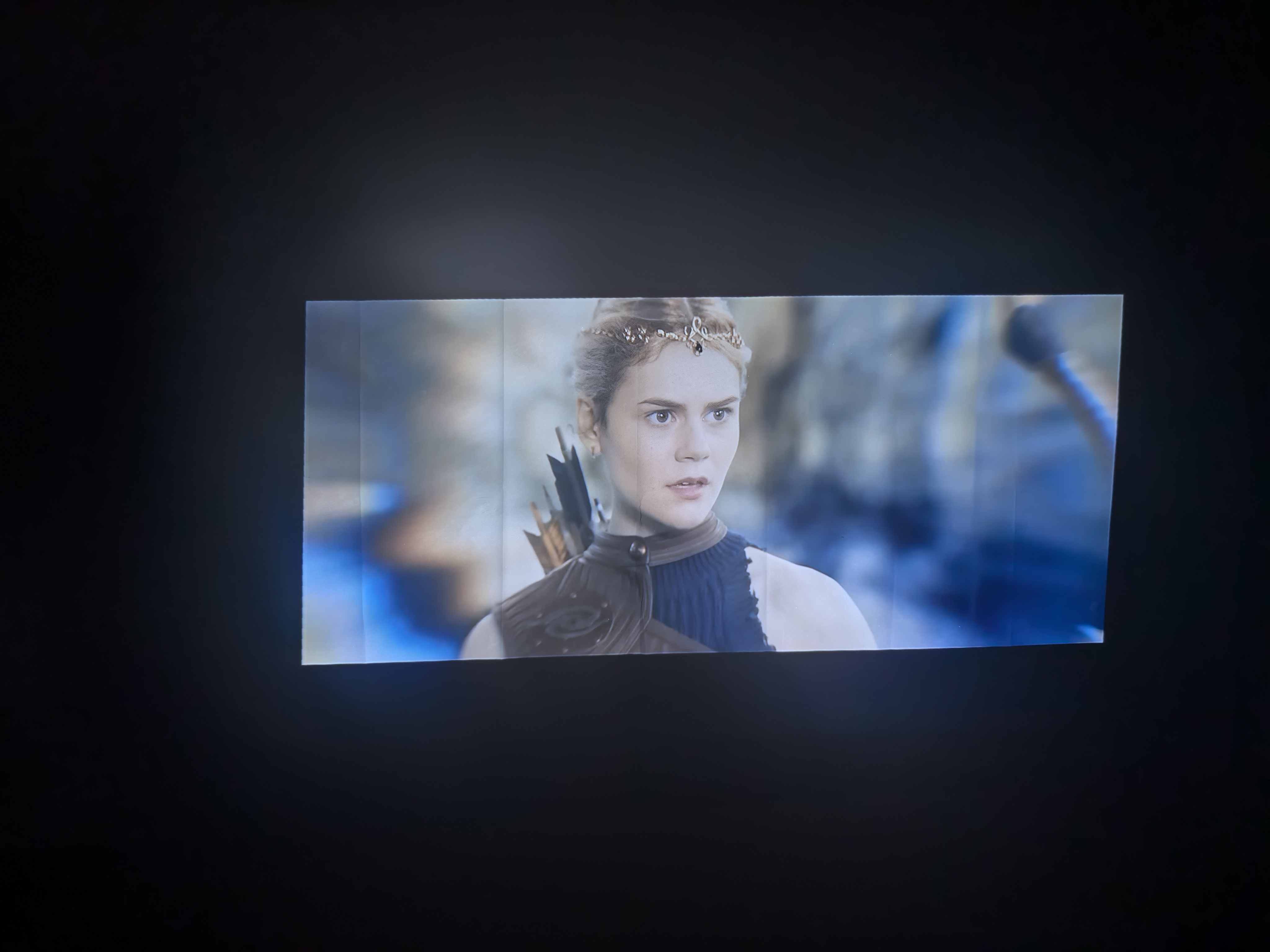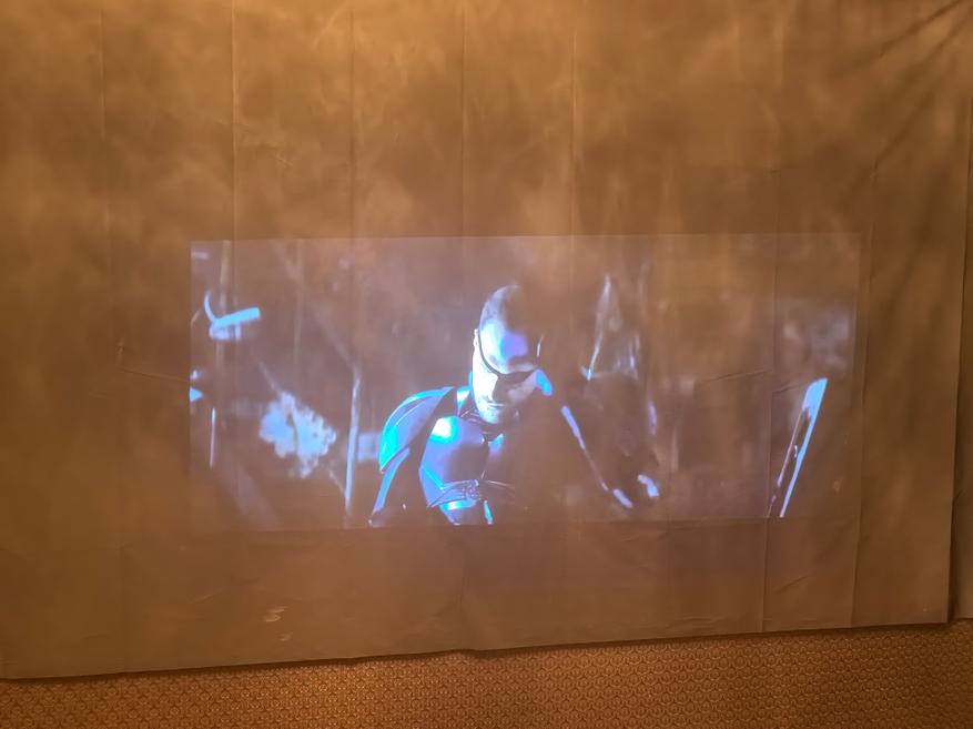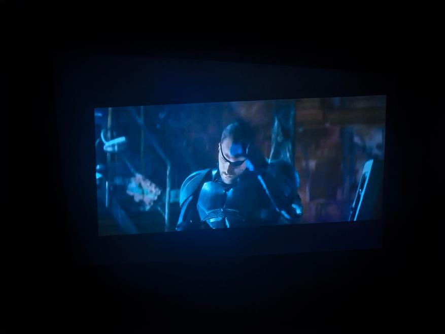 Дополнительно ещё показал две фотографии крупных планов. В кадрах выше и ниже расстояние до проекции — 193 см, диагональ проекции — 178 см (70″). Звук при прослушивании от встроенных динамиков мне понравился. Слышны басы, звук не писклявый и не ровный, интонация передается. Смотреть и слушать приятно.