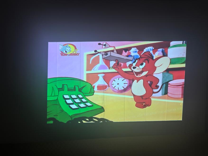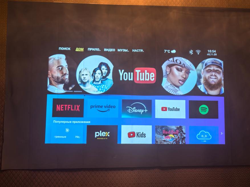 На следующих фотографиях привел примеры, как будет выглядеть проекция при просмотре разных фильмов с YouTube. Яркости хватает, но видно, что в углах не такая четкая и яркая картинка, как в центре.