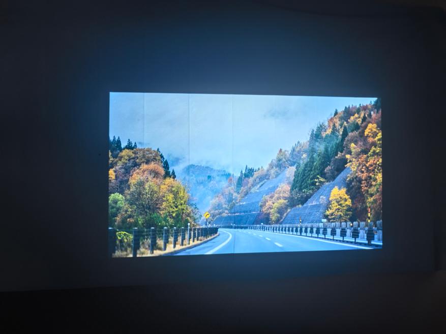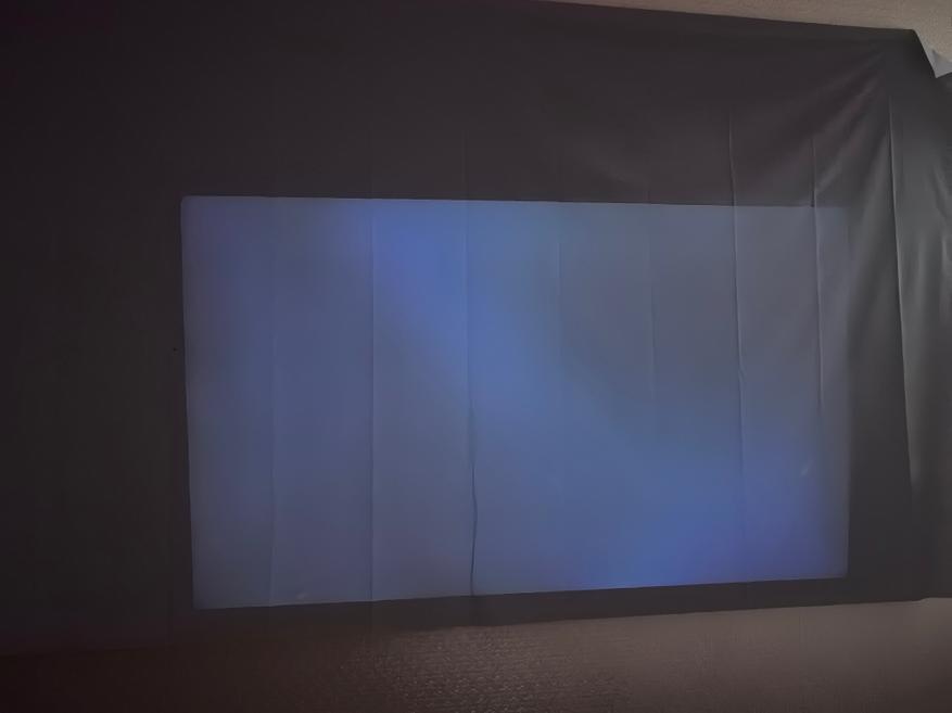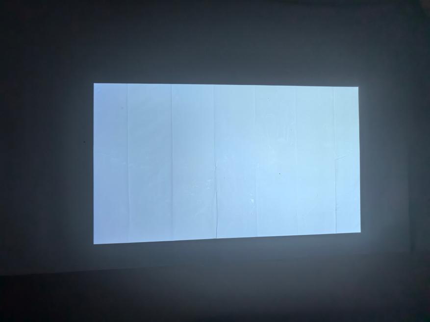 Ниже привел две фотографии серого и белого изображений с проектора для сравнения качества цветопередачи. Сравнение фотографий показывает, что яркость по площади проекции неравномерная. Первая фотография, если смотреть на правую часть, больше серая, чем белая, и обратное верно для левой части.