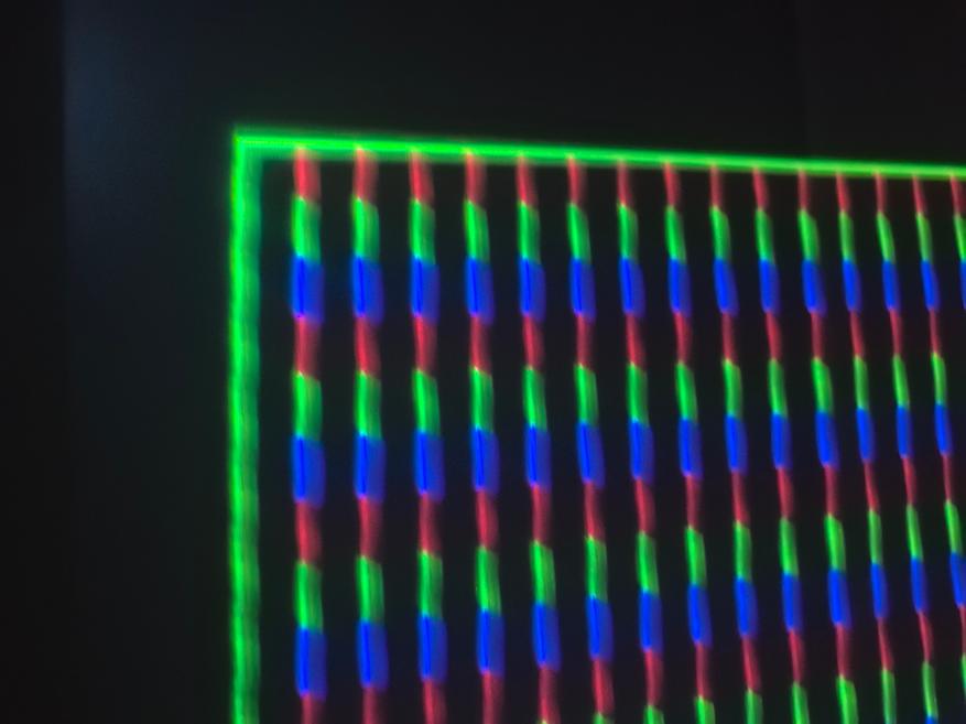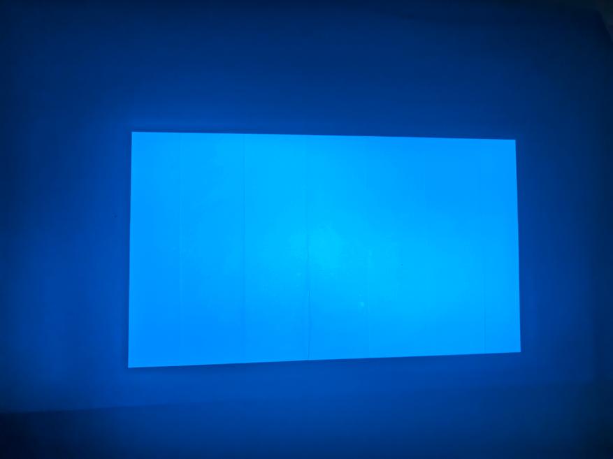 Третий замер яркости сделал с расстояния 150 см. Получились следующие цифры: ширина — 111 см, высота — 62 см, площадь — 0,6888 м², диагональ — 127 см (50″), яркость от 586 до 861 Лк. Следовательно, ANSI Lumen равен 488 Lm.