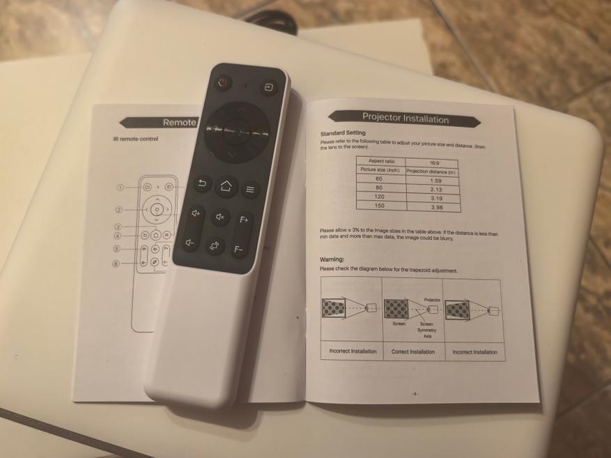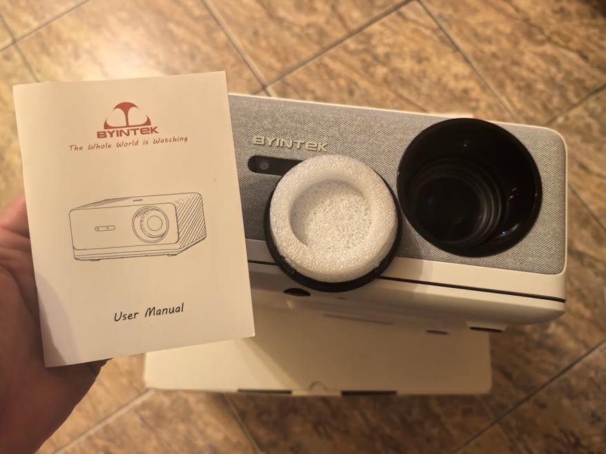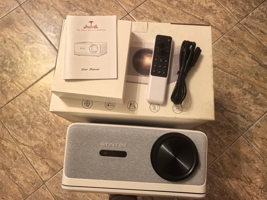 В состав коробки входит: проектор, кабель для подключения к сети 220В, пульт ДУ без 2 шт. батареек ААА и инструкция. Линза защищена крышкой с поролоном внутри.