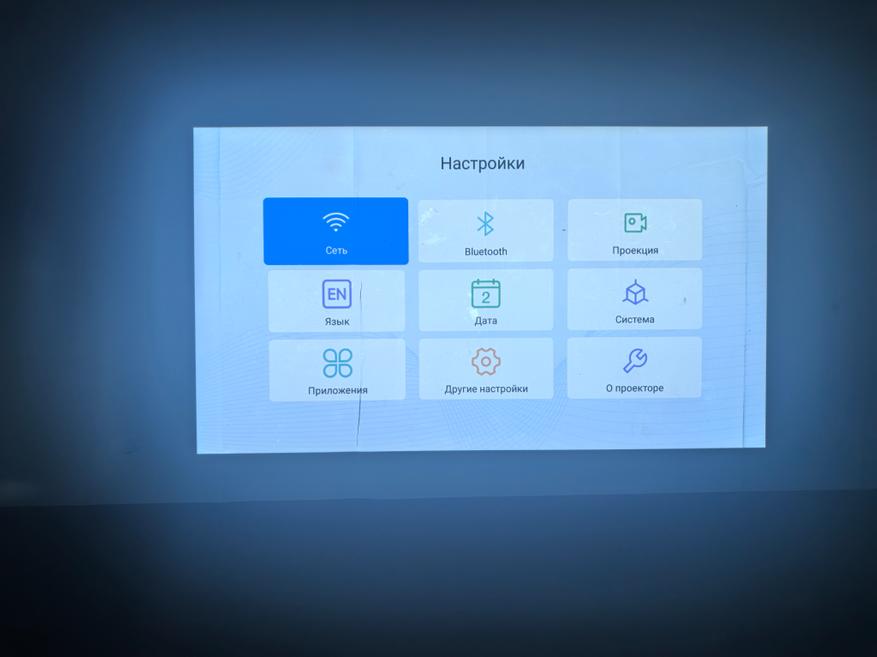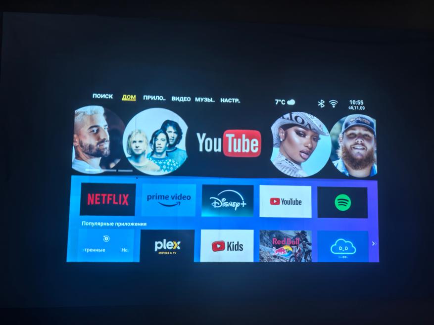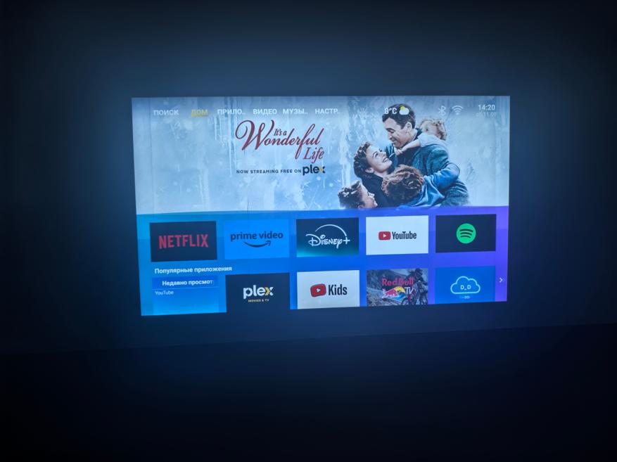 Проектор включается быстро. Ниже показана заставка и рабочий стол. Можно смотреть различные видео от сервисов, как Amazon, Netflix, Яндекс, КиноПоиск. Установить можно любой .apk-файл, так как операционная система — Android 9.