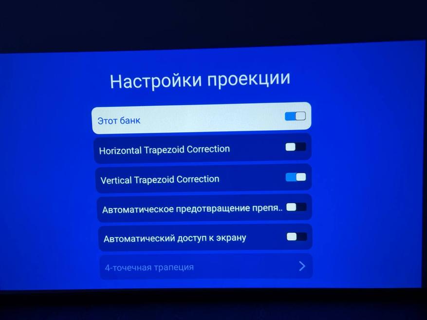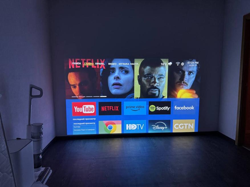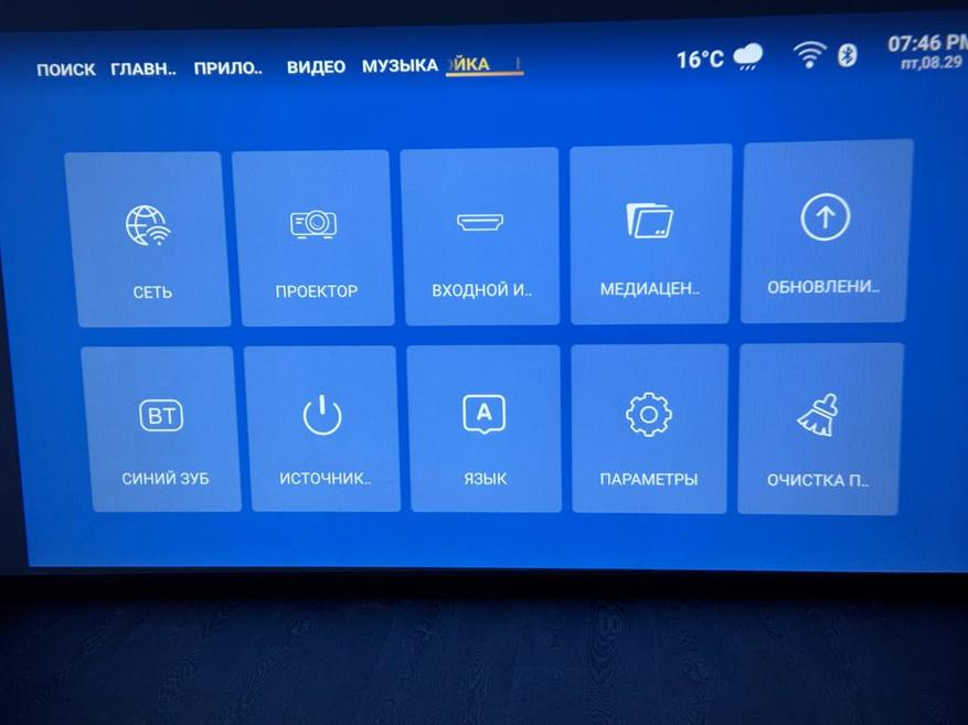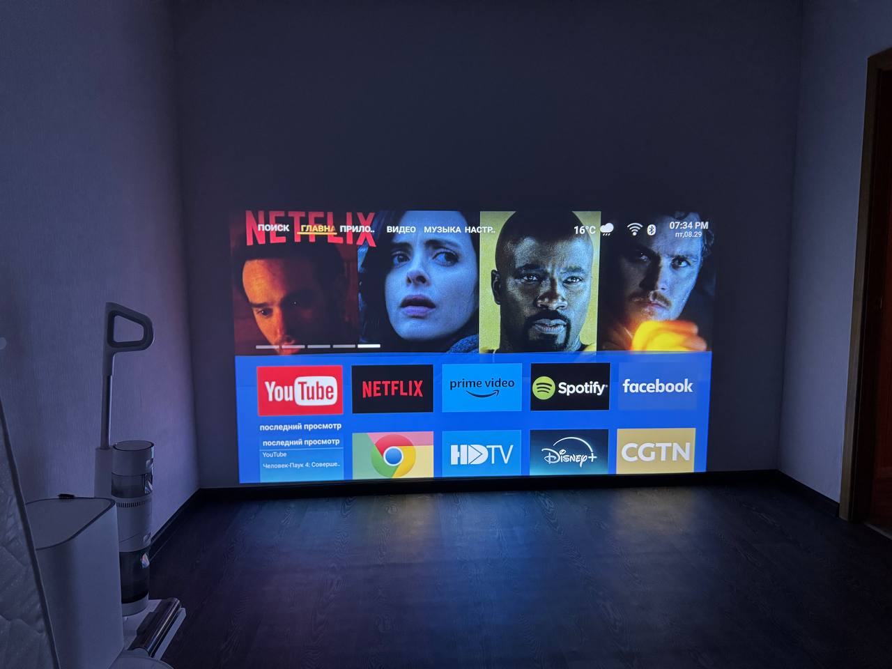 После включения встречает простая, но любимая мной оболочка. Интерфейс работает быстро, без подвисаний. Навигация лёгкая, всё вынесено на главный экран: настройки, приложения, медиаплеер. Можно настроить саму проекцию, язык, цветовую температуру, подключить Bluetooth устройства, Wi-Fi и другие интерфейсы, а также выбирать предустановленные режимы вроде «кино», «человек» или «динамический». В общем, все стандартно. Лаунчер не перегружен и работает быстрее, чем многие версии Android TV, где половина ресурсов уходит на фоновые процессы.