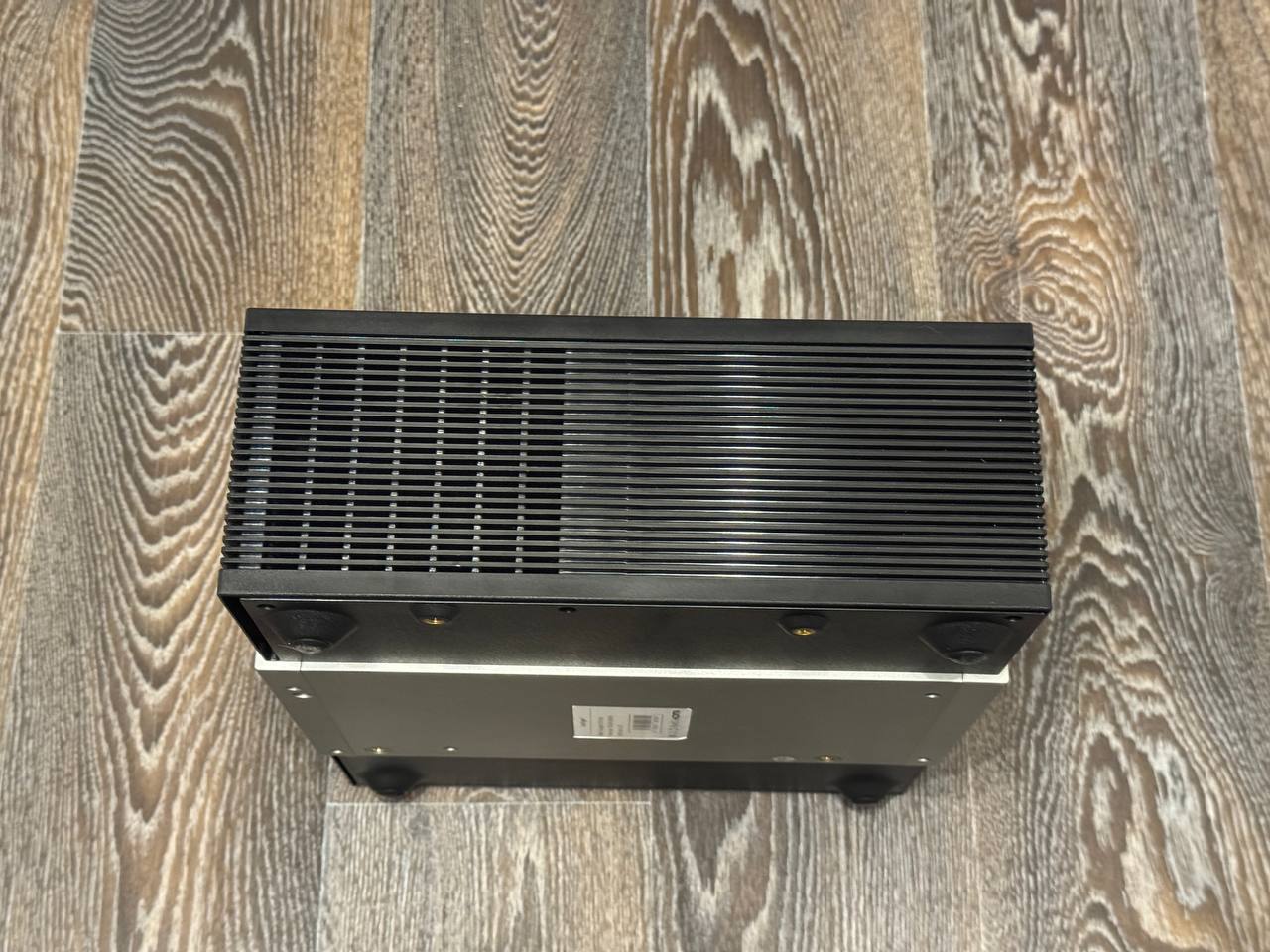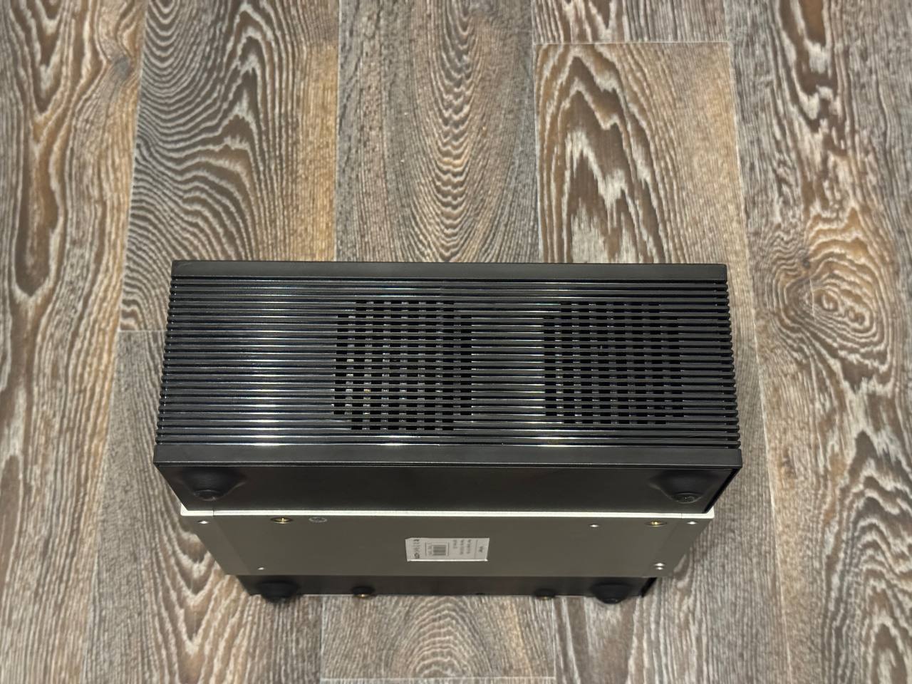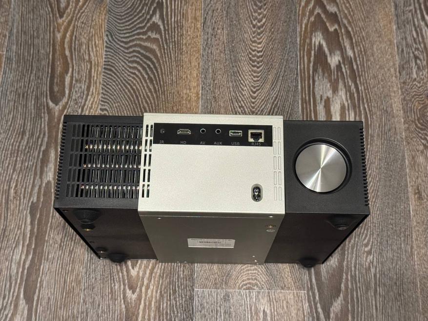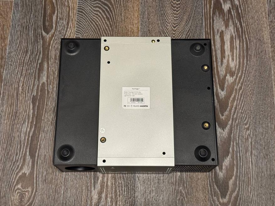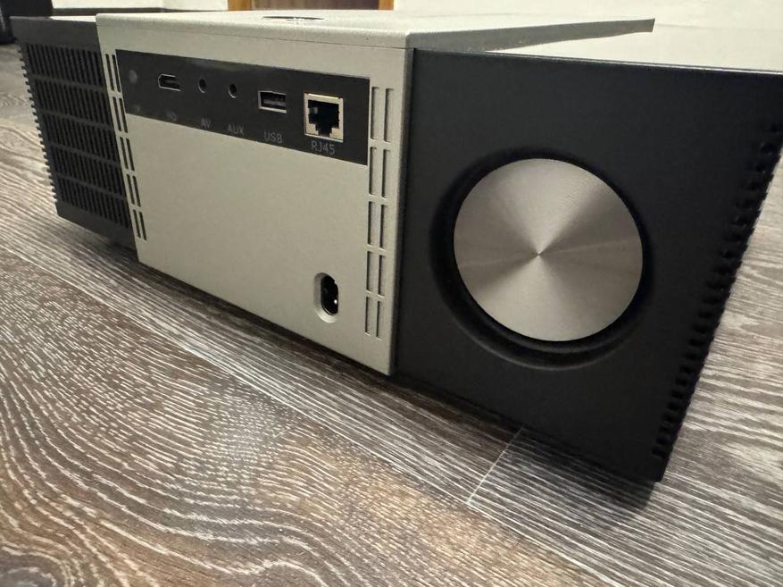 Сбоку расположены вентиляционные отверстия кулера и два динамика по 15W, сзади тоже есть решетка радиатора, основные разъемы и отдельный вуфер для низких частот. Звук у проектора — мое почтение, но об этом чуть дальше. Внизу четыре резиновые ножки, также предусмотрено крепление под штатив и паук VESA с нестандартной формой расположения резьбовых отверстий. Выглядит максимально странно. Особенно отверстие под штатив для того габаритного устройства.