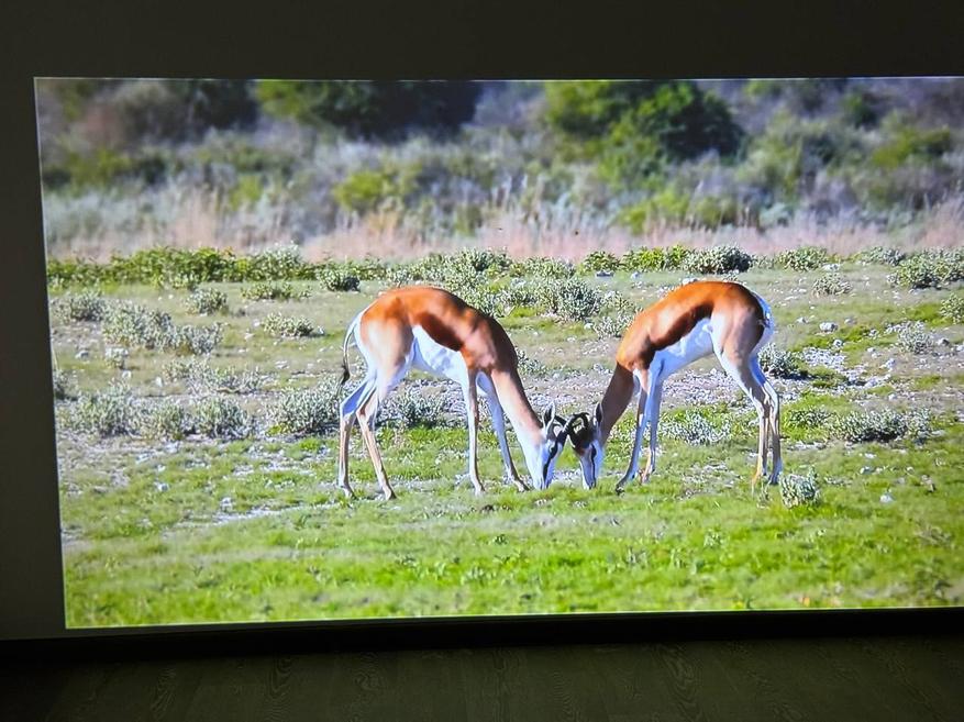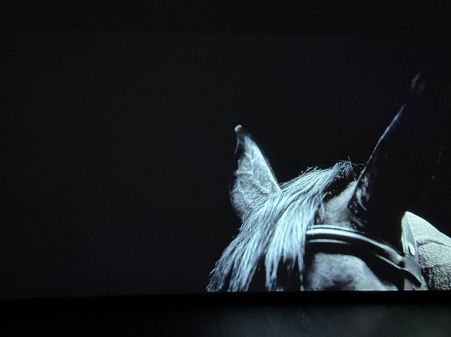 В традиционном тесте с лошадью проектор показал себя неплохо, но не без нюансов. Контрастность оттенков черного и серого цвета на достаточно хорошем уровне. В фрагменте с засветом тоже все неплохо — блоуминг и переход градиента практически незаметен. При сложных смешениях тонов и на нестандартных объектах типа волос можно наблюдать неестественные черные выжигания картинки. В демонстрационных 8К видео все более чем достойно. Для фильмов и сериалов за свои деньги и для неизбалованного пользователя проектор подходит идеально.
