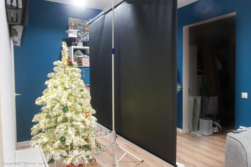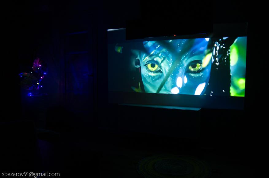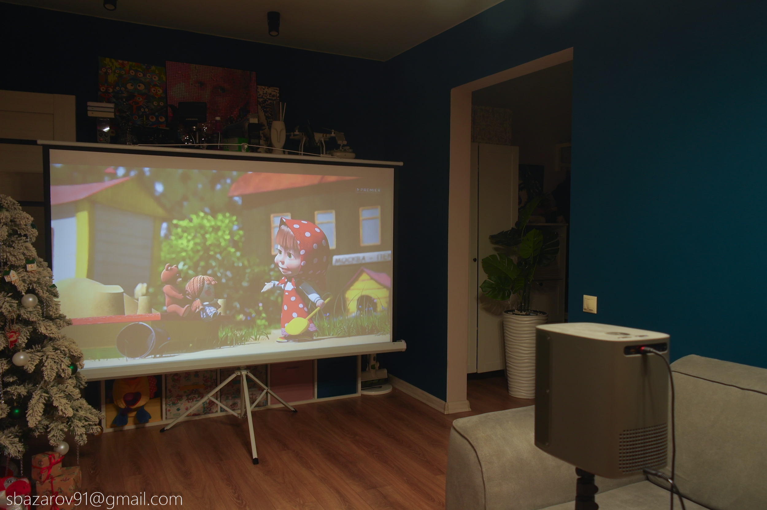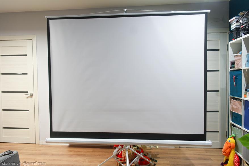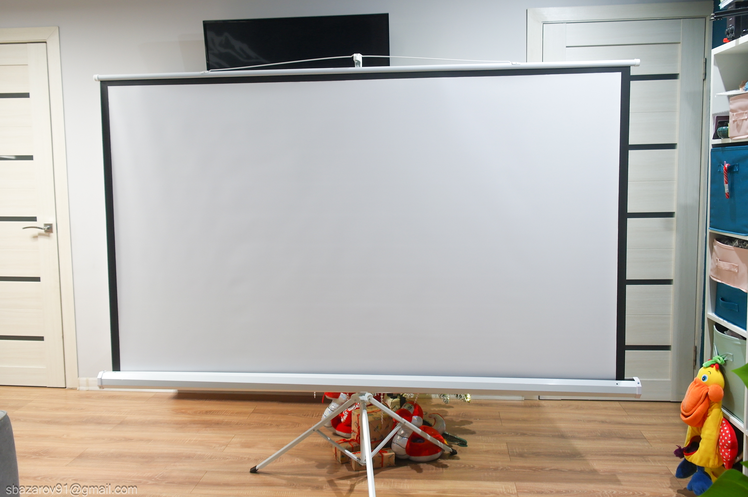 Переходим к тестированию. Основное название данного экрана — использование совместно с моим проектором TouYinger D8. Максимальный размер проекции может составлять 120 дюймов, что в масштабах квартиры довольно неудобно, так как необходима стенка с диагональю 3 метра. Обычно, в качестве полотна выступает стенка, покрашенная в серую матовую краску. Такое покрытие положительно сказывается на конечном изображении, добавляя изображению яркости и насыщенности цвета. Основное нарекание — неудобно смотреть что-то нестандартное и отличное от формата 16:9, так как конечное изображение накладывается на телевизор и ТВ-тумбу (пустая стенка находится между ними).
