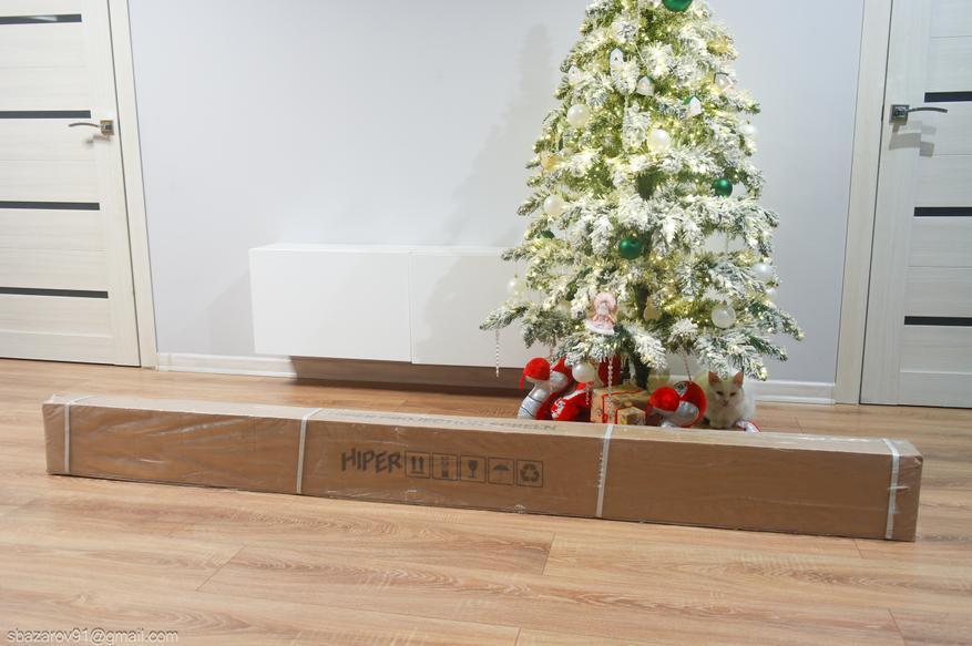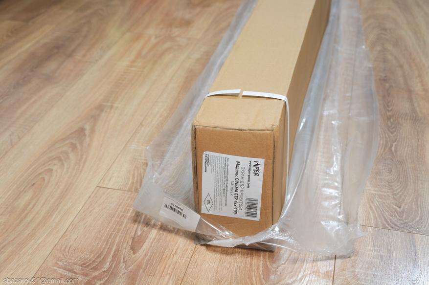 При покупке экрана для проектора HIPER CINEMA STP 4x3-100 мне выдали массивную коробку с габаритами 220*16*13см и весом 7 кг. Вся масса равномерно распределена по всей коробке, так что нести вполне удобно. Но еще удобнее забирать на автомобиле.