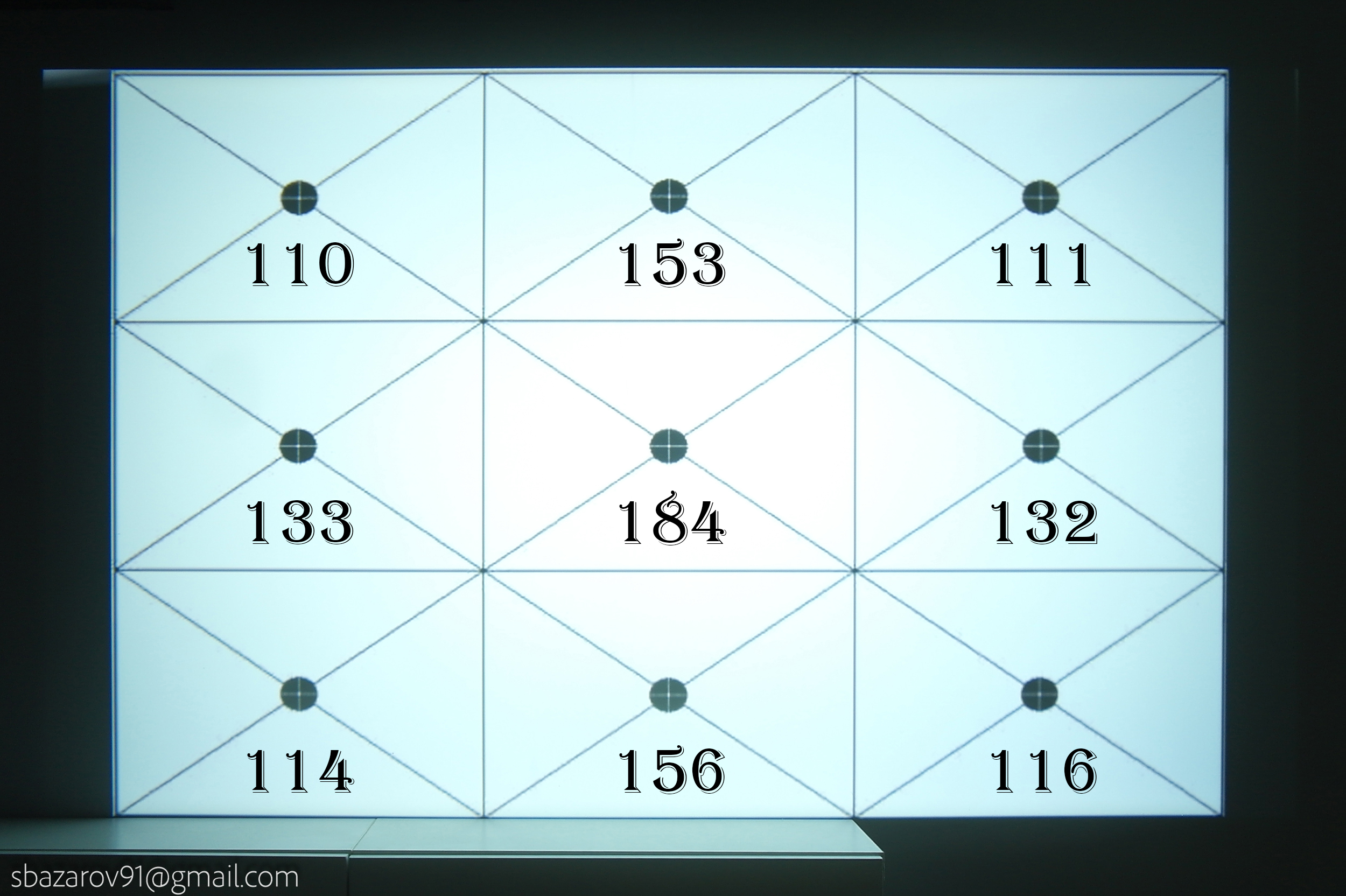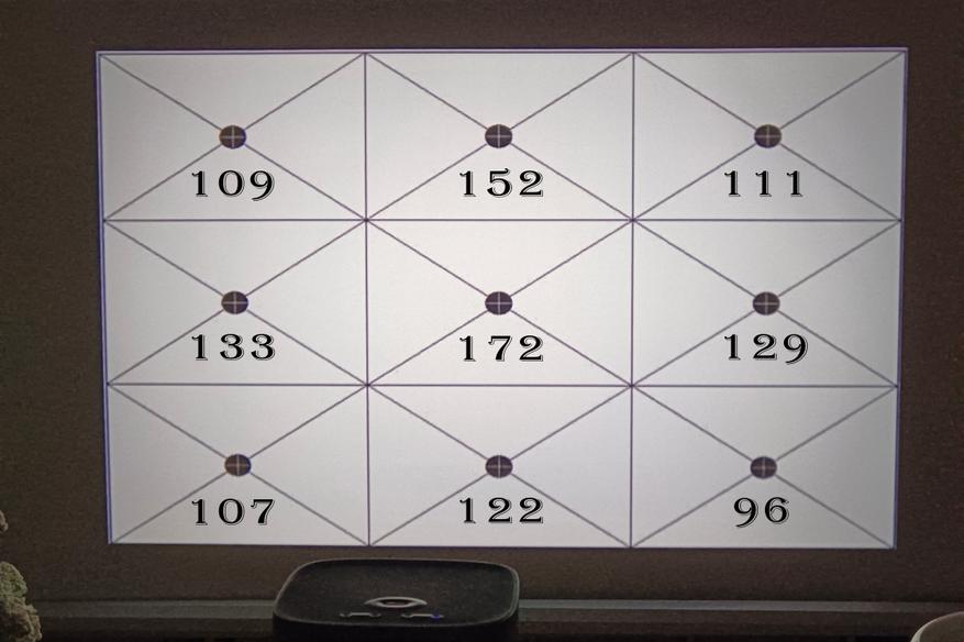 Произведем замер яркости и сравним его с показаниями, взятыми из обзора Touyinger D8. Параметры также возьмем из прошлого обзора. На удивление, полотно не обеспечило существенного прироста яркости, что говорит о правильно подобранном цвете и краске стен.