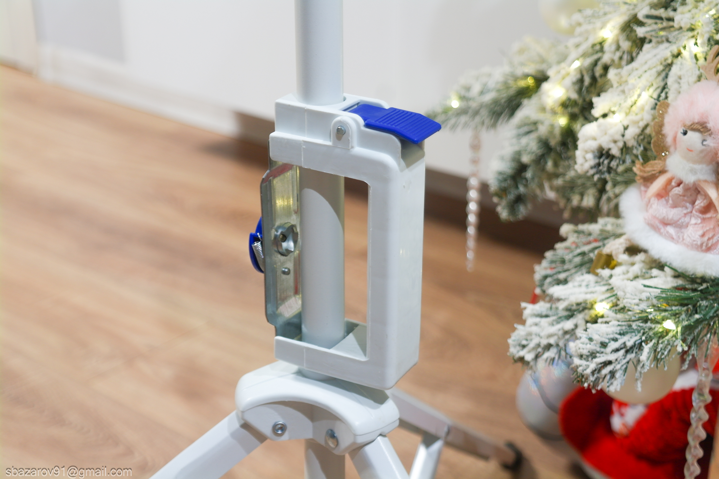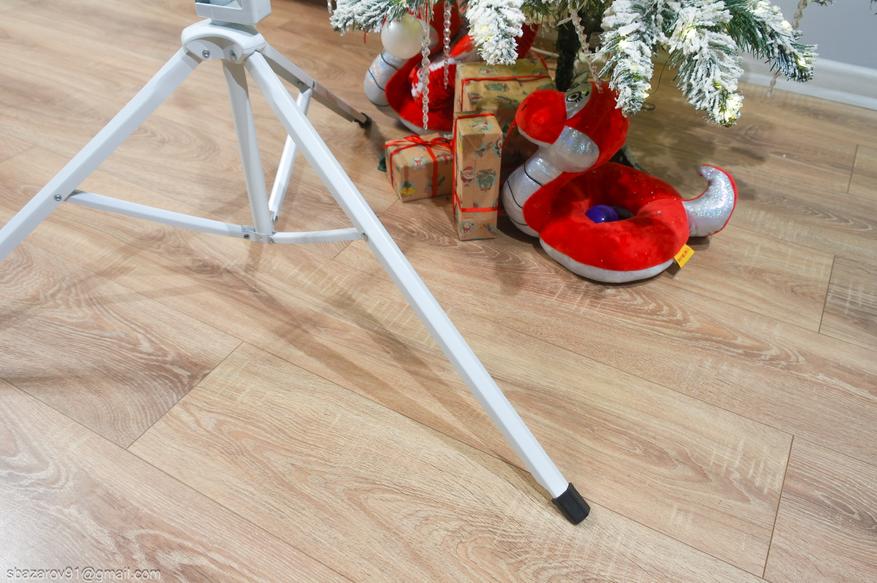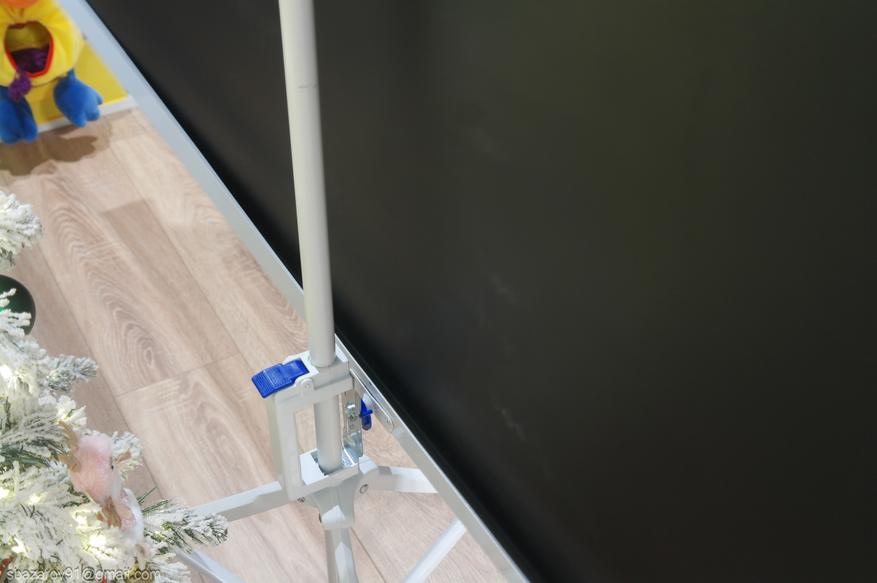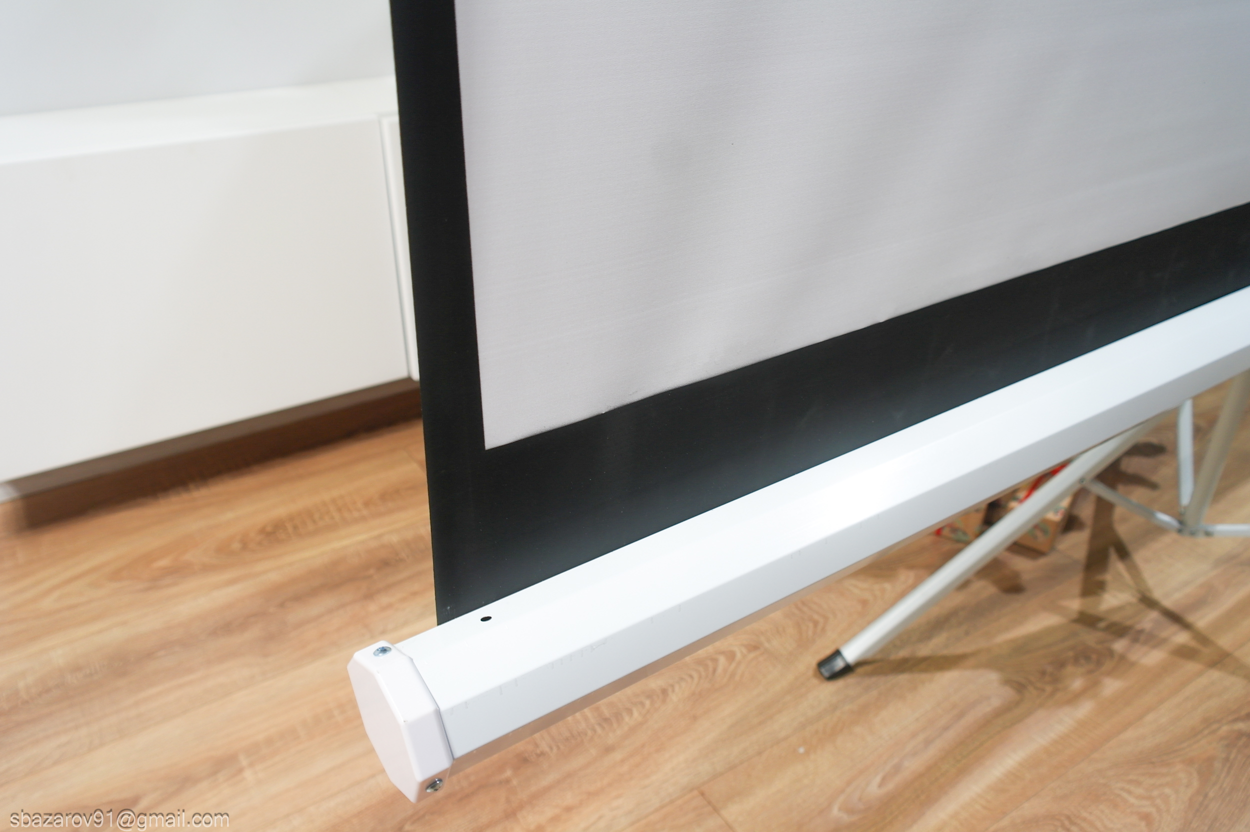 В первую очередь ознакомимся с кронштейном, он же тренога с центральной трубкой. В сложенном состоянии занимает минимум места, тогда как в раскрытом состоянии имеет равносторонний треугольник с длиной стороны 83см. В центре кронштейна вертикальная штанга, на которую крепится верхняя лямка полотна. Высота кронштейна дает возможность получать изображение формата 4:3, но одним движением руки можно сузить до стандартных 16:9 при просмотре фильмов.