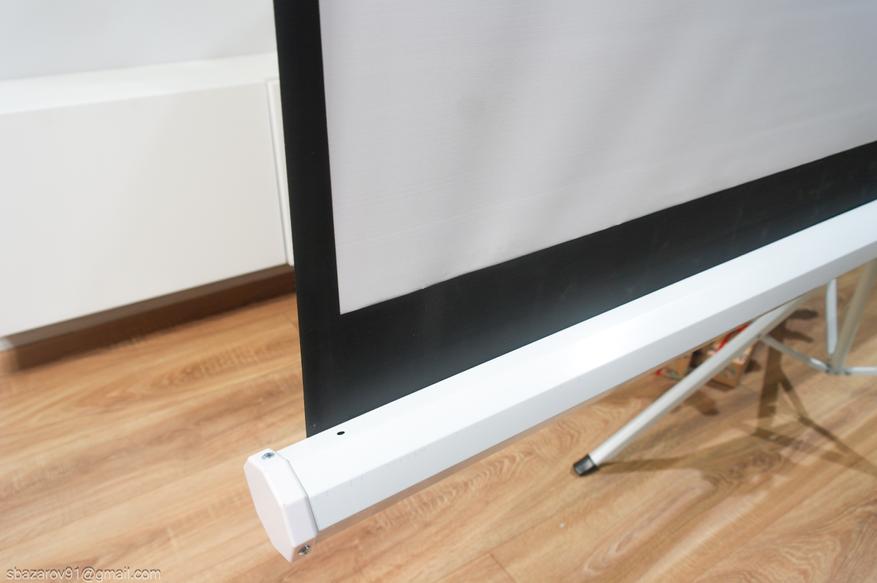 Внутри тренога с кронштейном и 100 дюймовое полотно. Для начала работы достаточно раскрыть треногу и навесить на нее полотно с экраном.