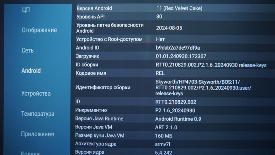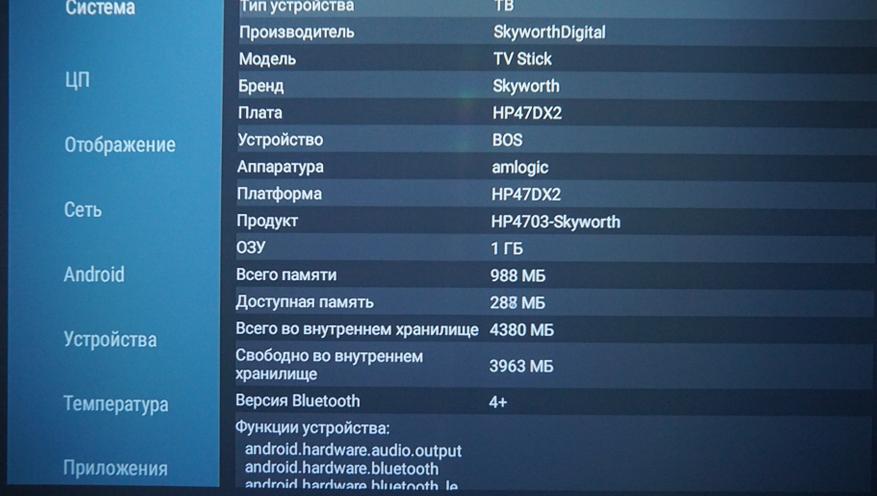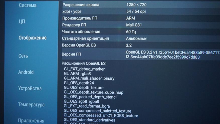 С помощью тестовых приложений удалось узнать, что в основе проектора лежит аппаратная платформа Skyworth HP47DX2. Внутри относительно свежий SoC Amlogic S805x2 ( 4 ядра ARM A35), видеоподсистема Mali-G31. Память ограничена 1 Гб ОЗУ и 8 Гб флеш-памяти (пользователю доступно чуть меньше половины этого значения).