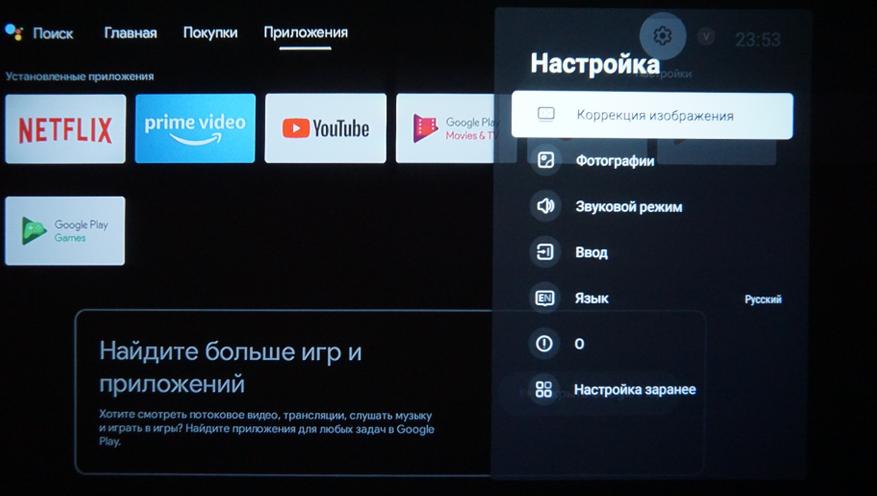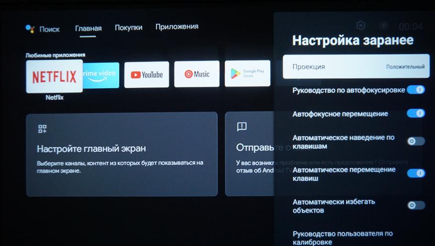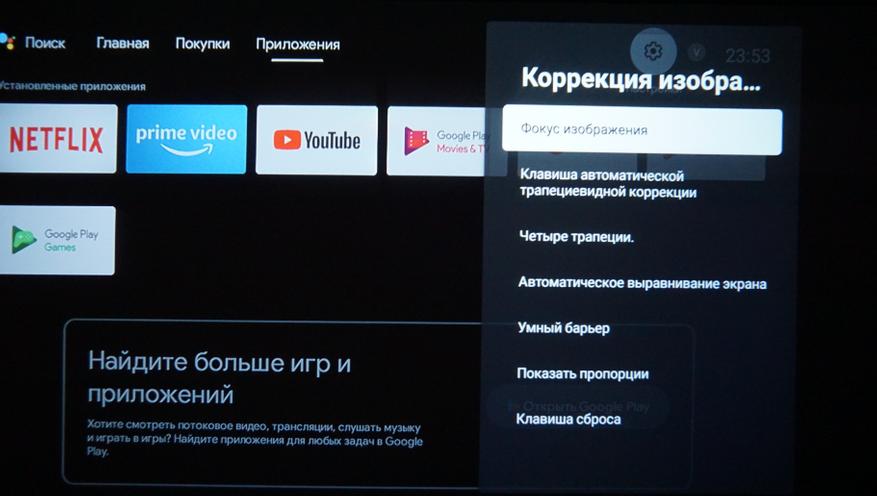 В качестве смарт-системы проектора предустановлена ОС Android версии 11. Имеется обновление как самой ОС, так и встроенного ПО проектора. Есть возможность установить приложения как с маркета, так и пользовательские (с веб-сервисов или с внешней флешки). Кстати, фильмы можно смотреть с USB-флешки или внешнего HDD, подключённого к порту USB на задней панели. Предусмотрен ряд системных настроек, настроек изображения (в том числе ручная коррекция).