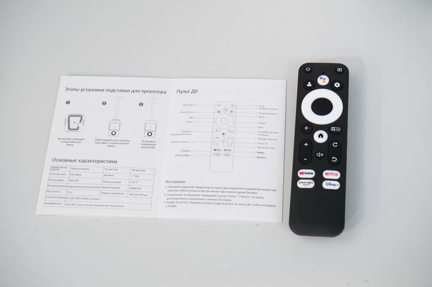 Работает пульт от пары ААА-батареек (нет в комплекте). К слову, инструкция предусматривает подробное описание кнопок пульта, а также способов установки и эксплуатации проектора, на русском языке и с иллюстрациями.