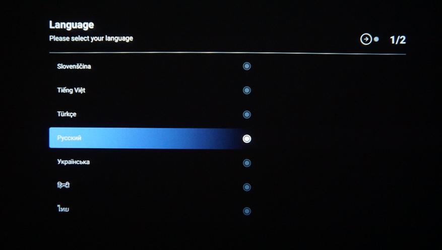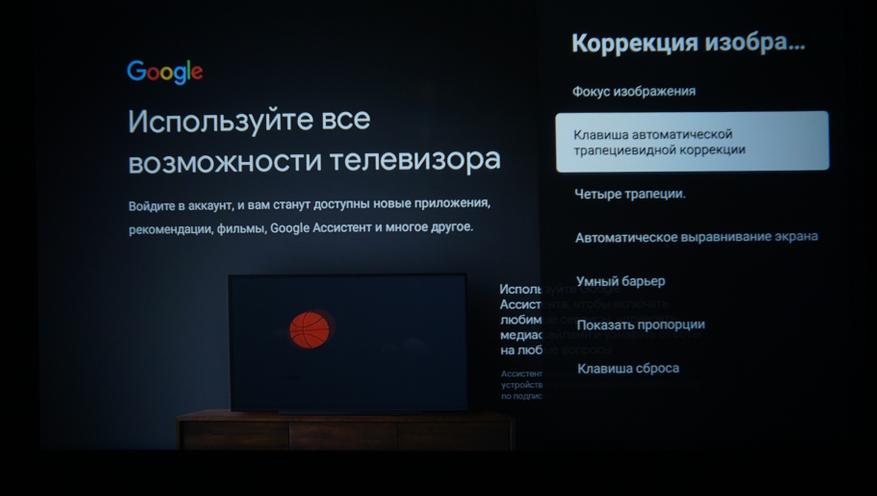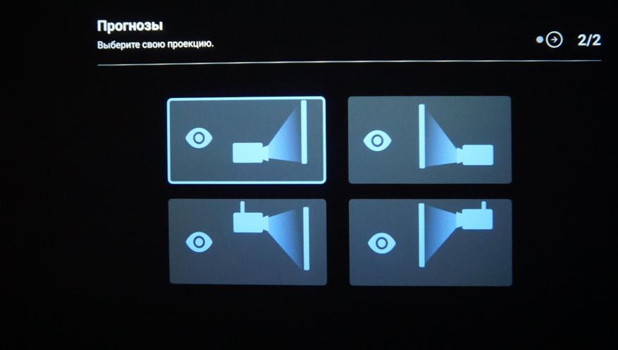 Модель Wanbo Projector T2 Ultra обеспечивает проекционное соотношение 1.2 к 1, то есть изображение с диагональю 100 дюймов (два с половиной метра) можно получить при установке на трех метрах. Максимальная диагональ в 4.5 метра (130″). Для тестов я установил его на расстоянии, чуть меньше двух с половиной метров — как раз для маленькой комнаты. При включении проектор самостоятельно настраивает резкость. Выполняется подстройка (коррекция) трапеции, то есть автоматика выравнивает изображение даже при установке под углом.