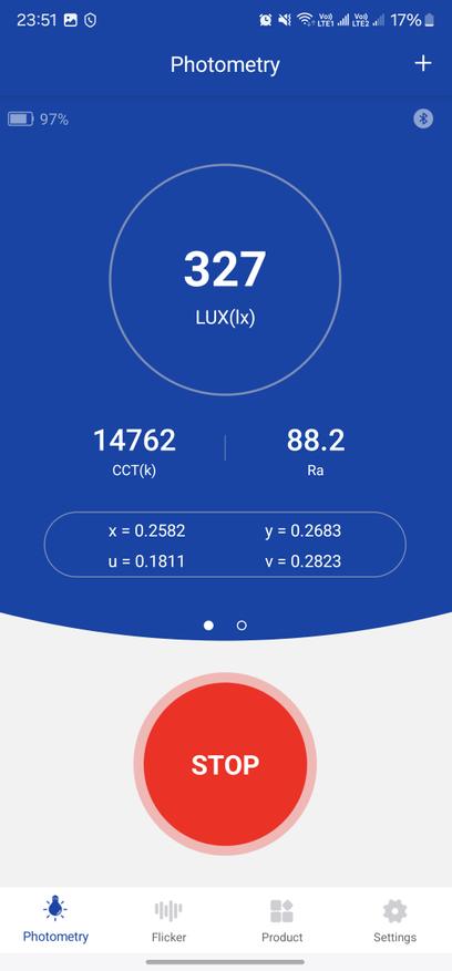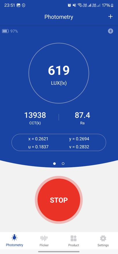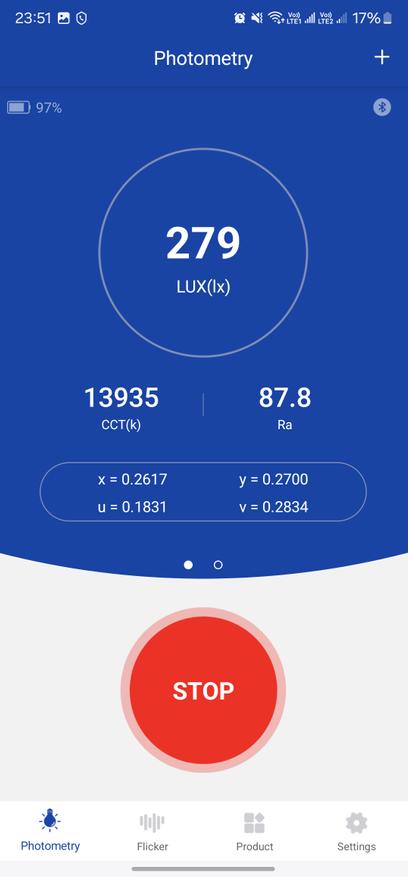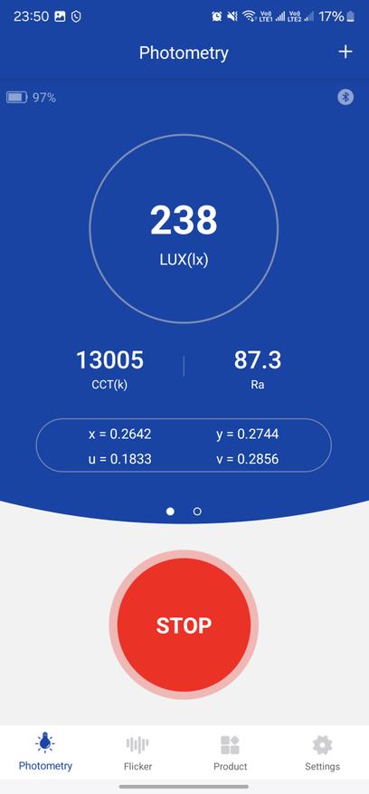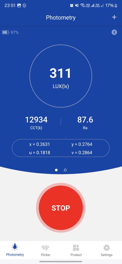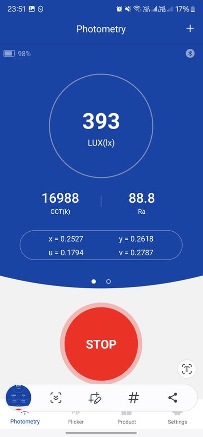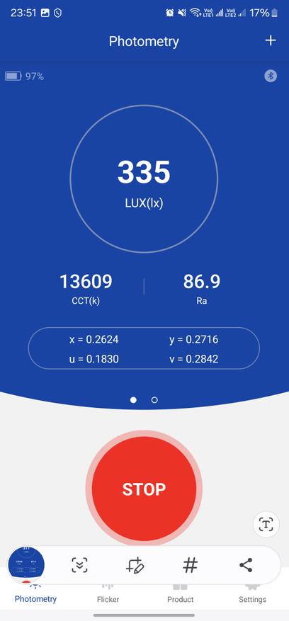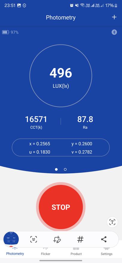 Произвел серию замеров для оценки яркости проектора. Стоит обратить внимание, что в стандартных настройках установлена яркость на уровне 50%. Заходим в соответствующее меню, выбираем пользовательский режим, устанавливаем на 100%. Используем для теста изображение с чистым белым фоном (RGB 255,255,255). Наиболее корректные измерения получаются при отключенной автофокусировке/автотрапеции, и на минимальном расстоянии, доступном для фокусировки. Пододвинул проектор поближе к экрану, диагональ получилась около 40-45″. Прикладываю скриншоты с тестера-люксометра. По расчетам вышло около 515 лм, небольшая разница связана с погрешностью измерений (дальность установки, площадь экрана, люксометр), но подтверждает заявленные характеристики (500 ANSI лм).