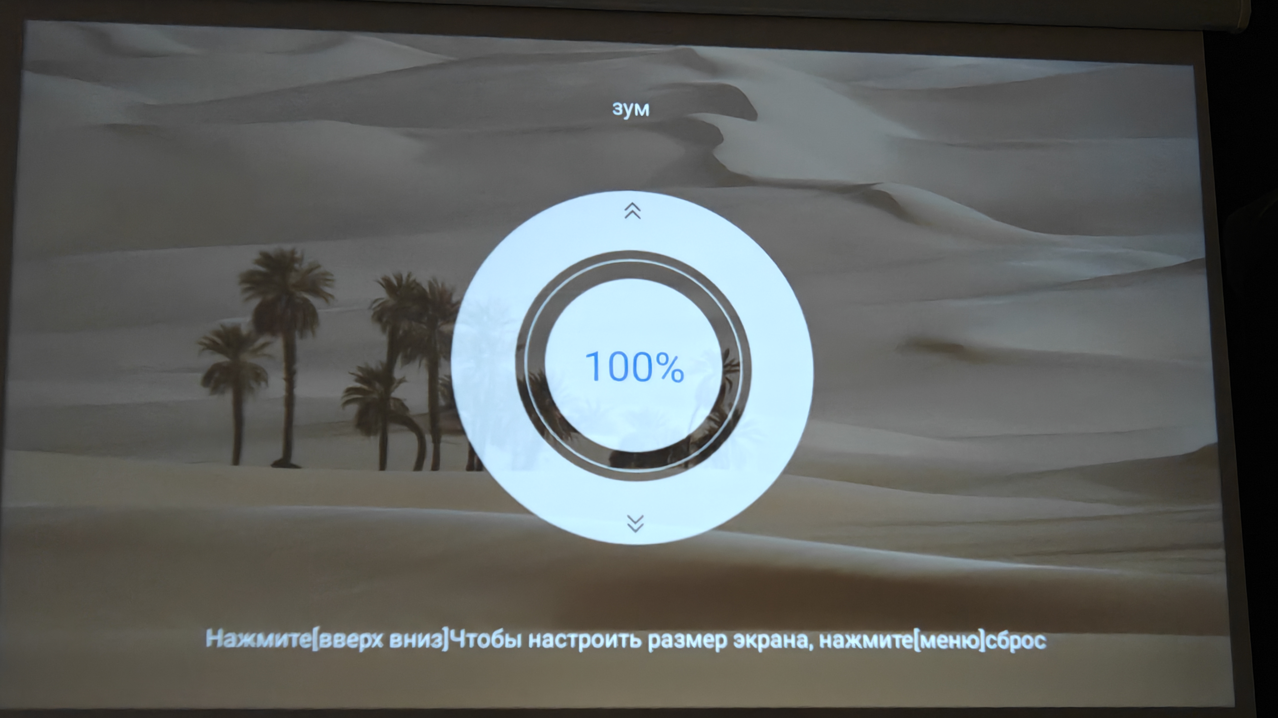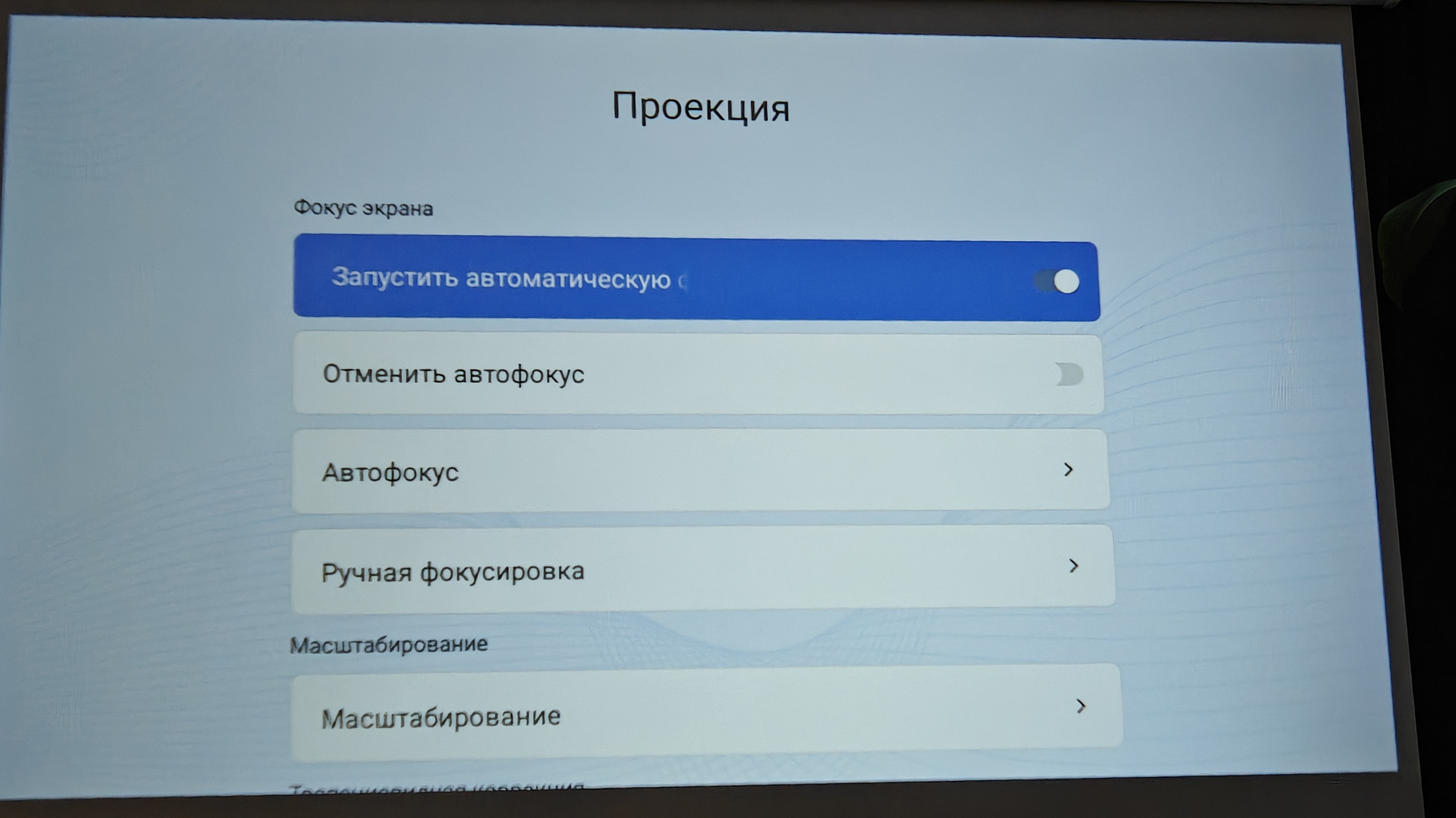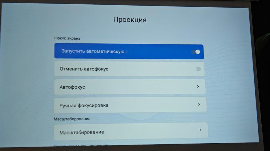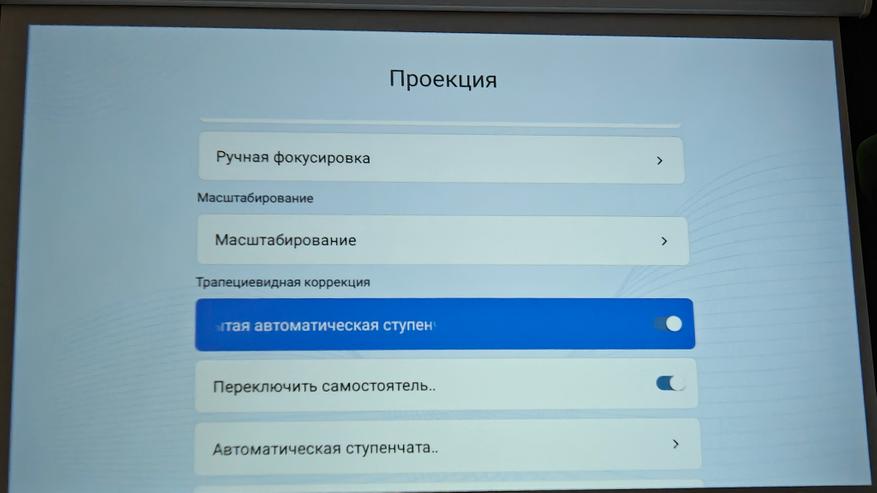 Что мне понравилось, так это то, что при запуске проектор проводит автоматическую подстройку под условия использования. Выравнивает трапеции, настраивает фокус. Я никогда не размещаю проектор по центру, чтобы не мешал просмотру, а просто ставлю на кронштейне справа от экрана, и он автоматически корректно выстроил мне большой экран. Таким образом экран получился около 100 дюймов и занял практически всю стену моей комнаты.