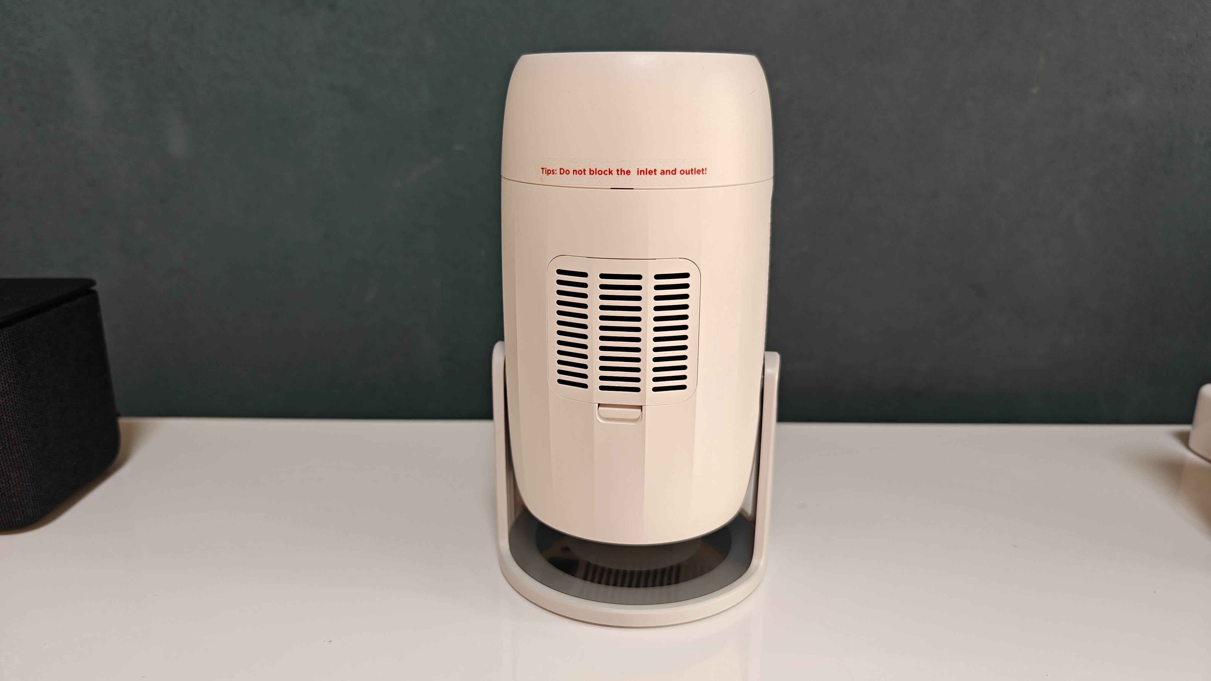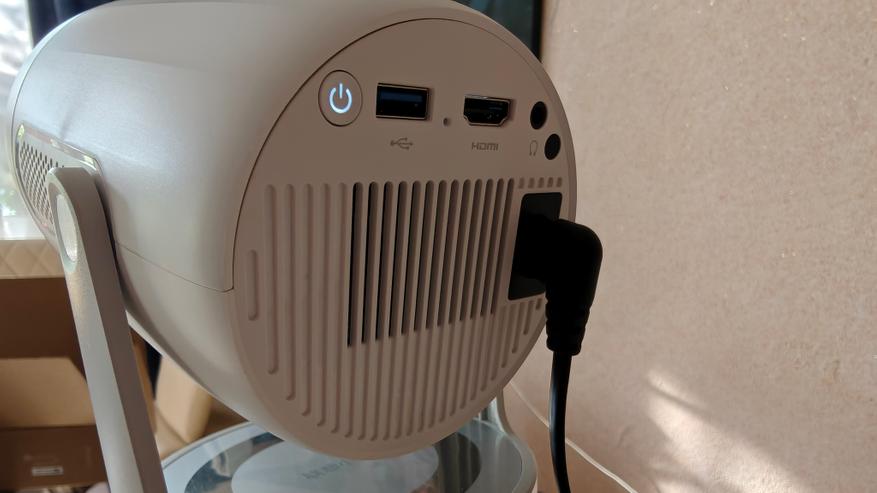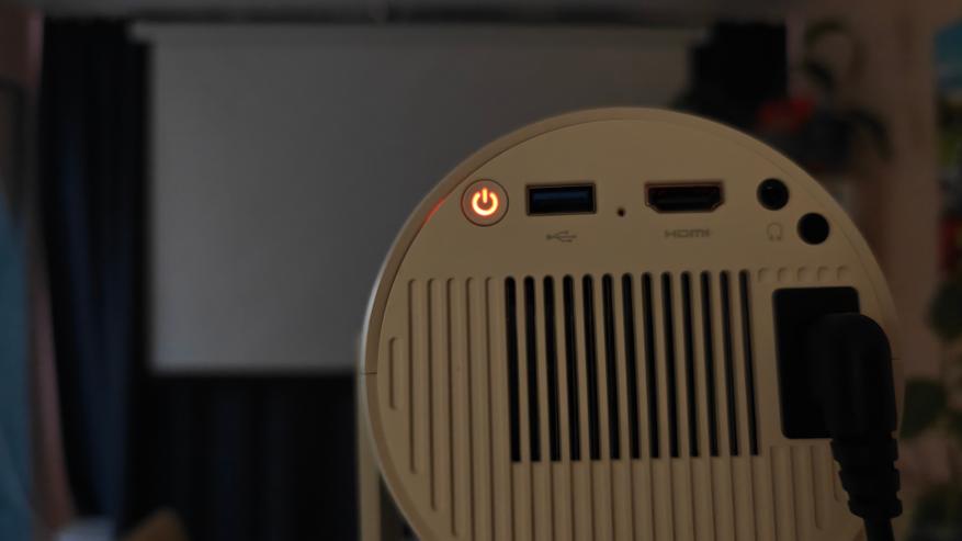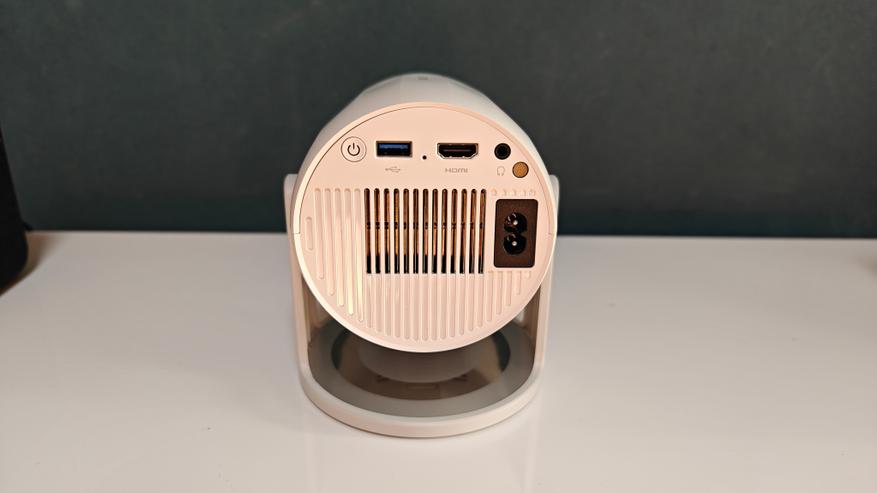 Задний торец проектора содержит прорези для охлаждения, кнопку включения, USB разъем, HDMI разъем, отверстие 3.5 мм для наушников, глазок фотоприемника сигналов с пульта и разъем питания.