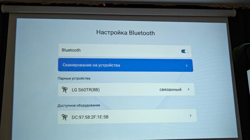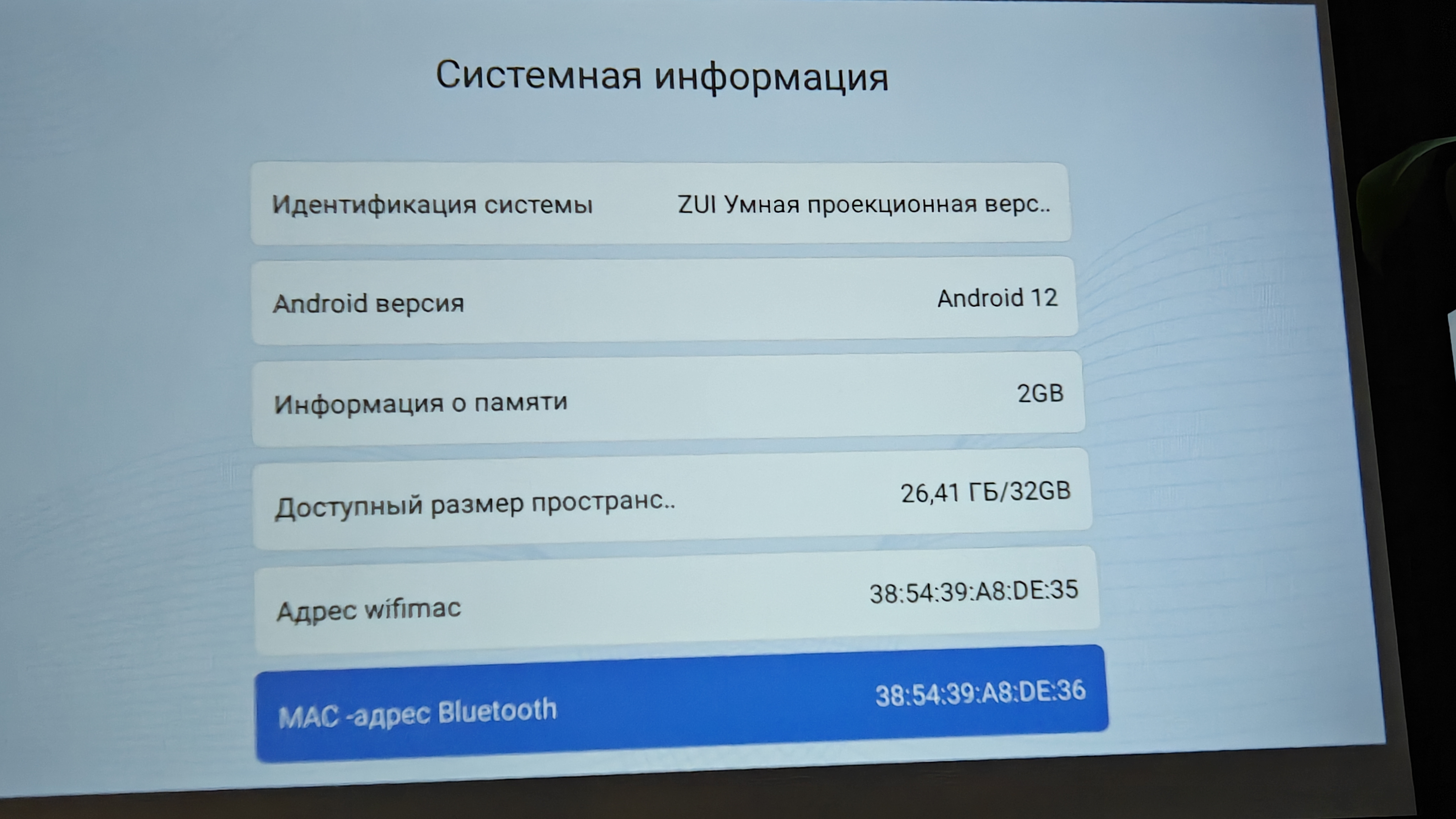 После запуска проектор даст выбрать язык использования, предложит подключиться к Wi-Fi сети. Кстати, сразу отмечу, что он поддерживает Wi-Fi сети 6-го поколения, а значит можно будет показать любой контент онлайн. Пульт обычный не Bluetooth, но ловит практически с любого угла, даже не надо целиться в глазок. В настройках есть параметры авто фокусировки и авто настройки трапеций, а также возможности отзеркаливания и перевертывания картинки при подвешивании проектора. Также можем просмотреть информацию об устройстве, убедиться что есть 2 ГБ ОЗУ и 16 ГБ ПЗУ. Я сразу подключил свой домашний кинотеатр по Bluetooth.