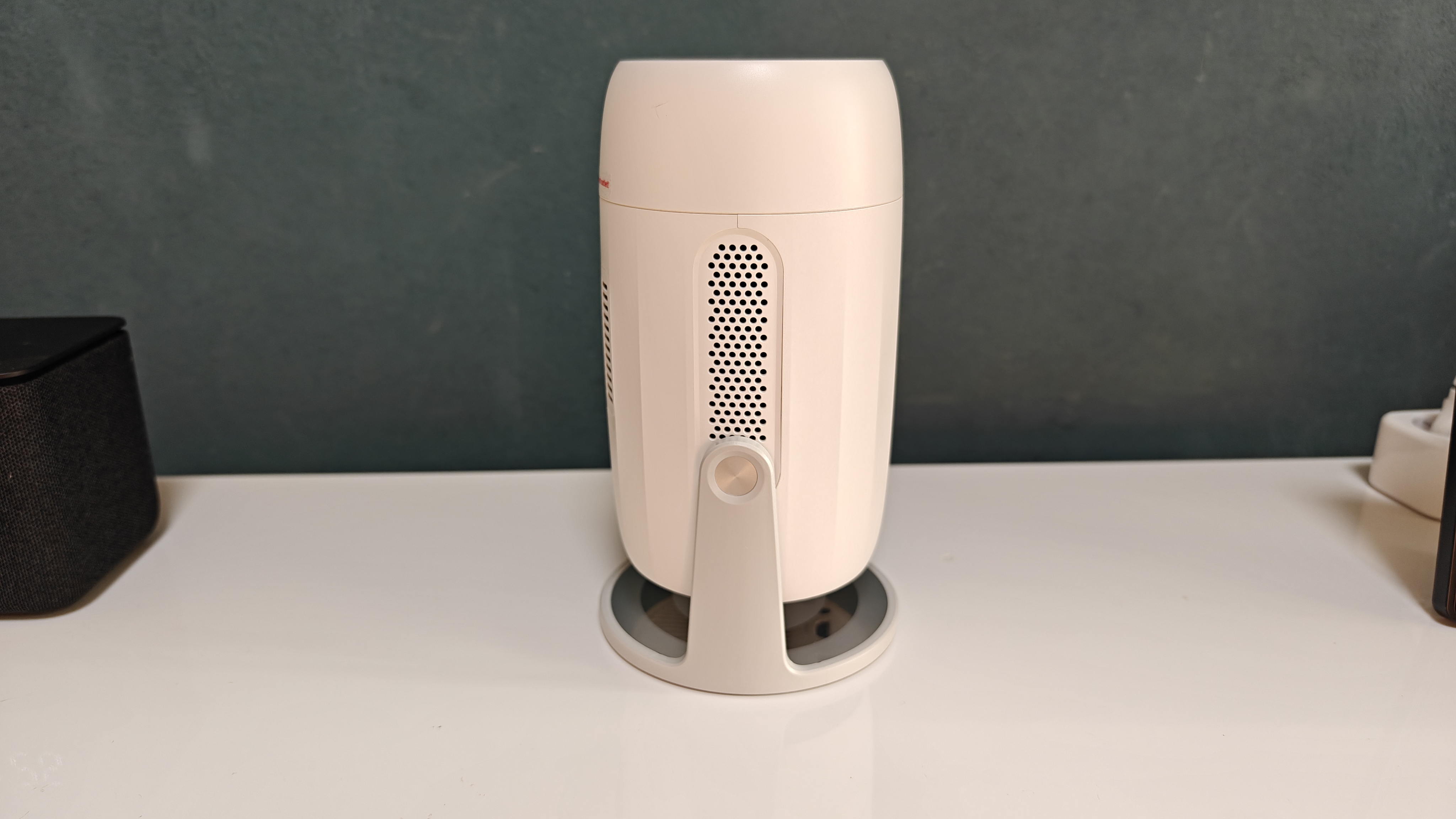 Когда говоришь о проекторе, представляется совсем не такой корпус. Тут не привычный параллелепипед. Корпус выполнен в форме белого пластикового бочонка с пластиковым кронштейном и вентиляционными отверстиями по всем сторонам.