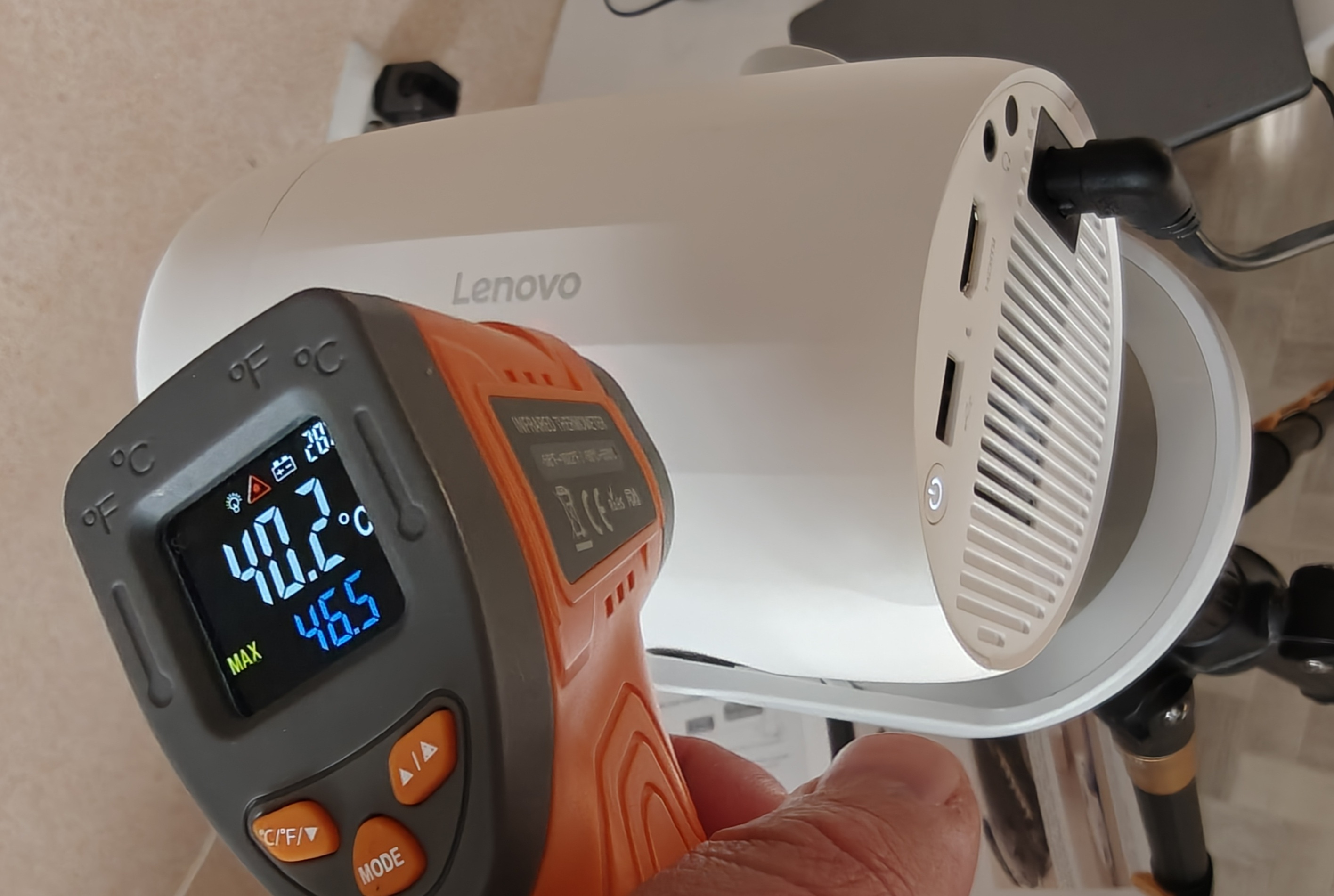 Во время работы горячий воздух выводится назад. Температура не превысила 46.5С. Сам проектор вообще ни разу не перегрелся, даже при длительном просмотре и температуре в помещении около 30 С.