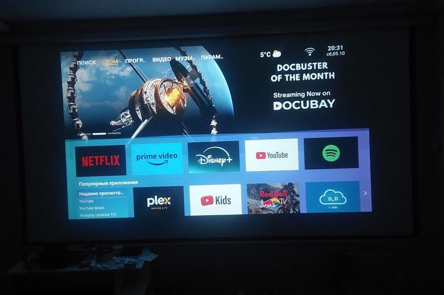 Проектор работает на Android 9.0 с кастомизированной оболочкой. Предустановленные приложения: Netflix, YouTube, Spotify, браузер Chrome. Доступен Google Play для установки приложений (Кинопоиск, Twitch, IPTV-сервисов