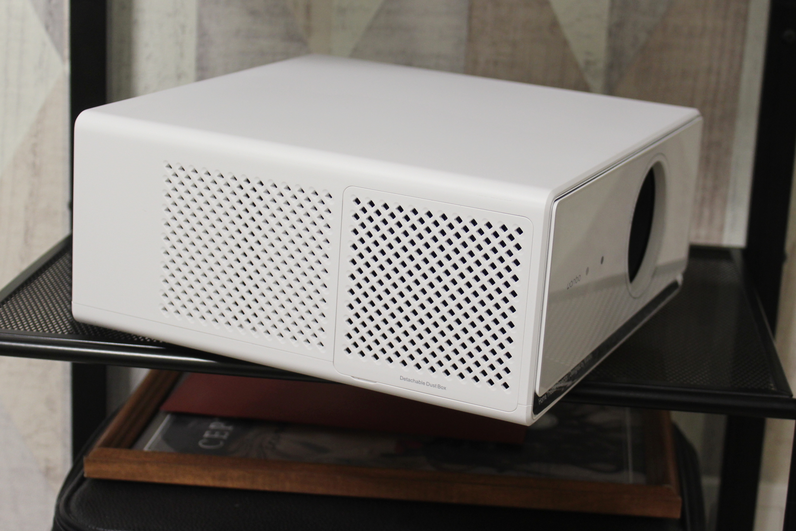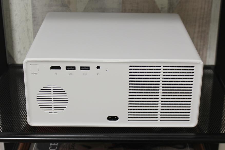 В плане дизайна имеем белый скругленный прямоугольный проектор из довольно качественного пластика. Люфтов, скрипов и прочих неприятностей не обнаружено. Спереди — логотип и маркировки, сзади — все разъемы и вентиляци. Фильтр от пыли находится на левой стороне и извлекается за 1 секунду.