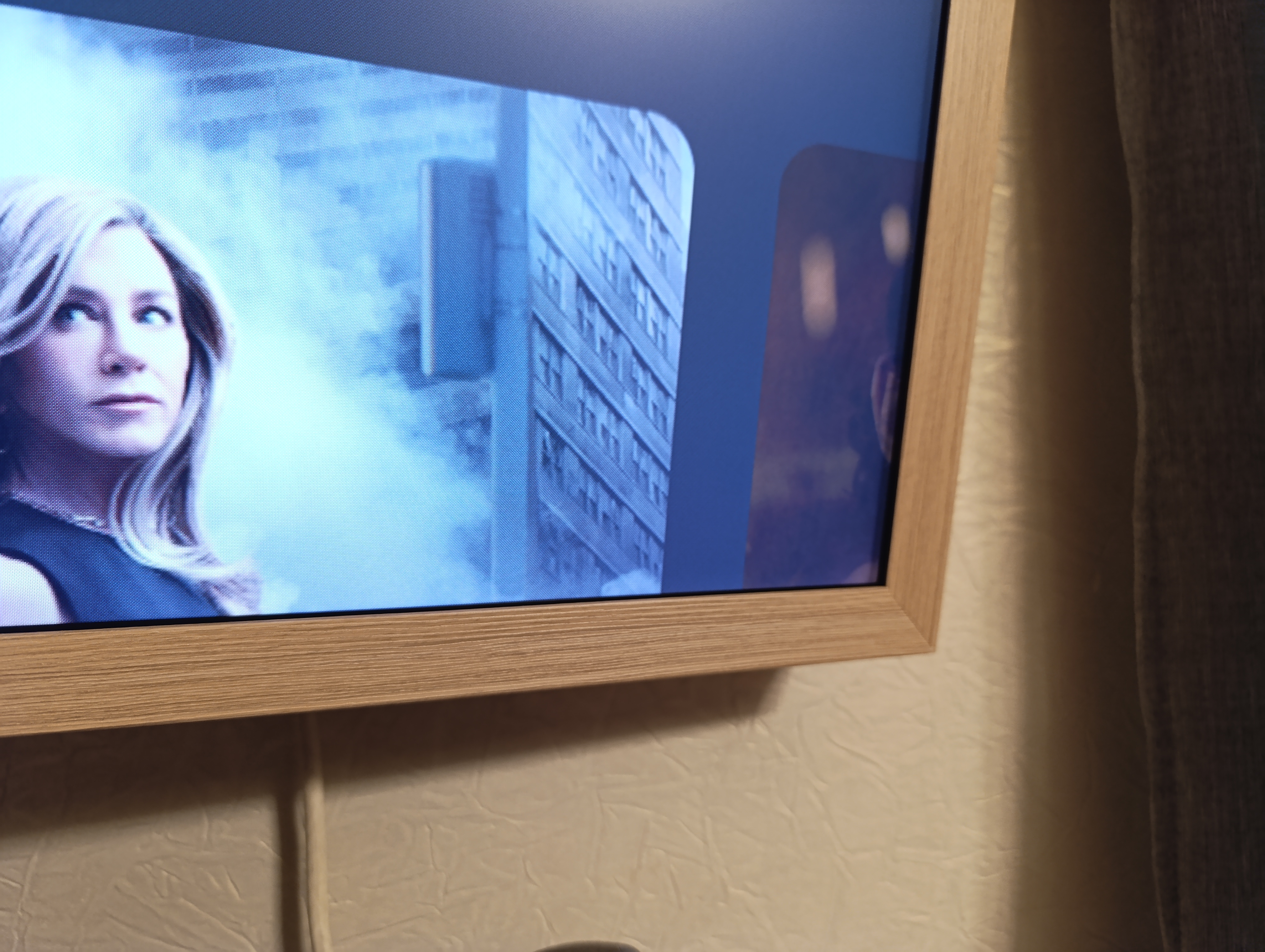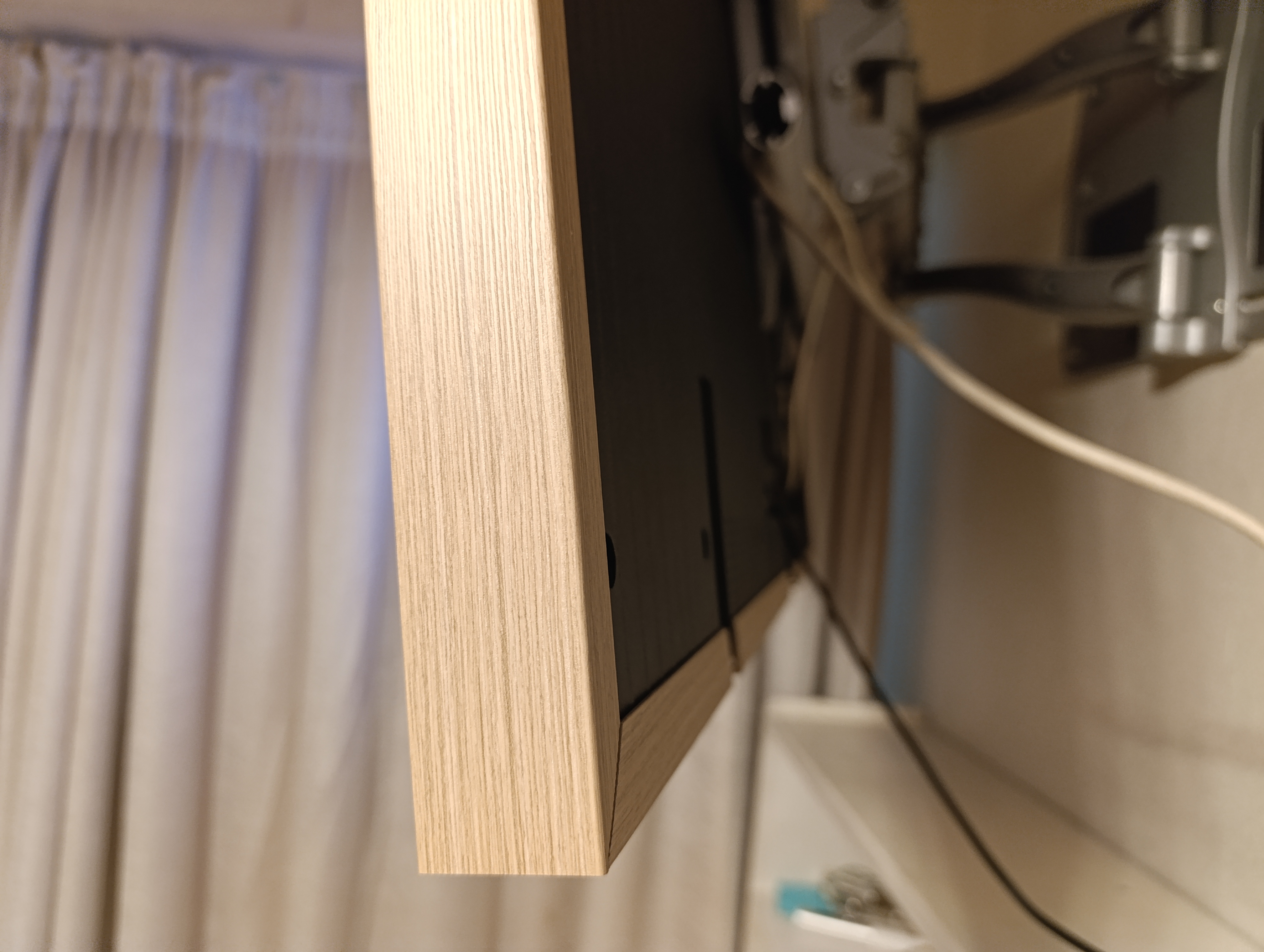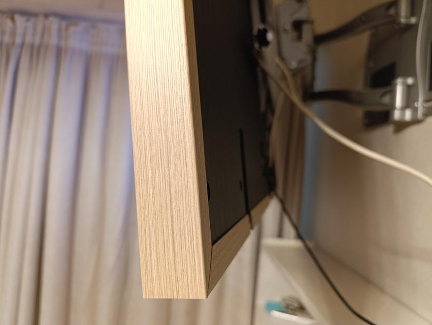 Еще одно приятное дополнение — это декоративные рамки, имитирующие различные сорта дерева. В комплекте моего телевизора шла рамка светлого цвета. Такие рамки легко устанавливаются на защелки и также легко снимаются. Они очень легкие, из пластика. И на удивление хорошо подошли к бежевой палитре моей комнаты.