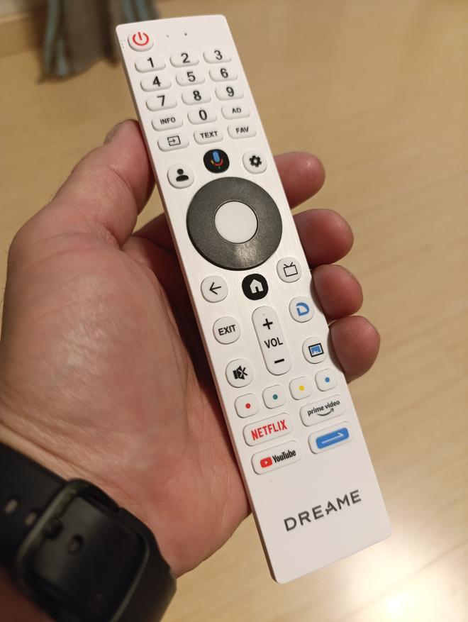 Пульт управленияказался несколько необычным. Dreame Q100F построен на платформе Goggle TV, поэтому такое количество кнопок выглядит излишним. Однако все необходимое на нем присутствует, включая кнопки быстрого вызова приложений