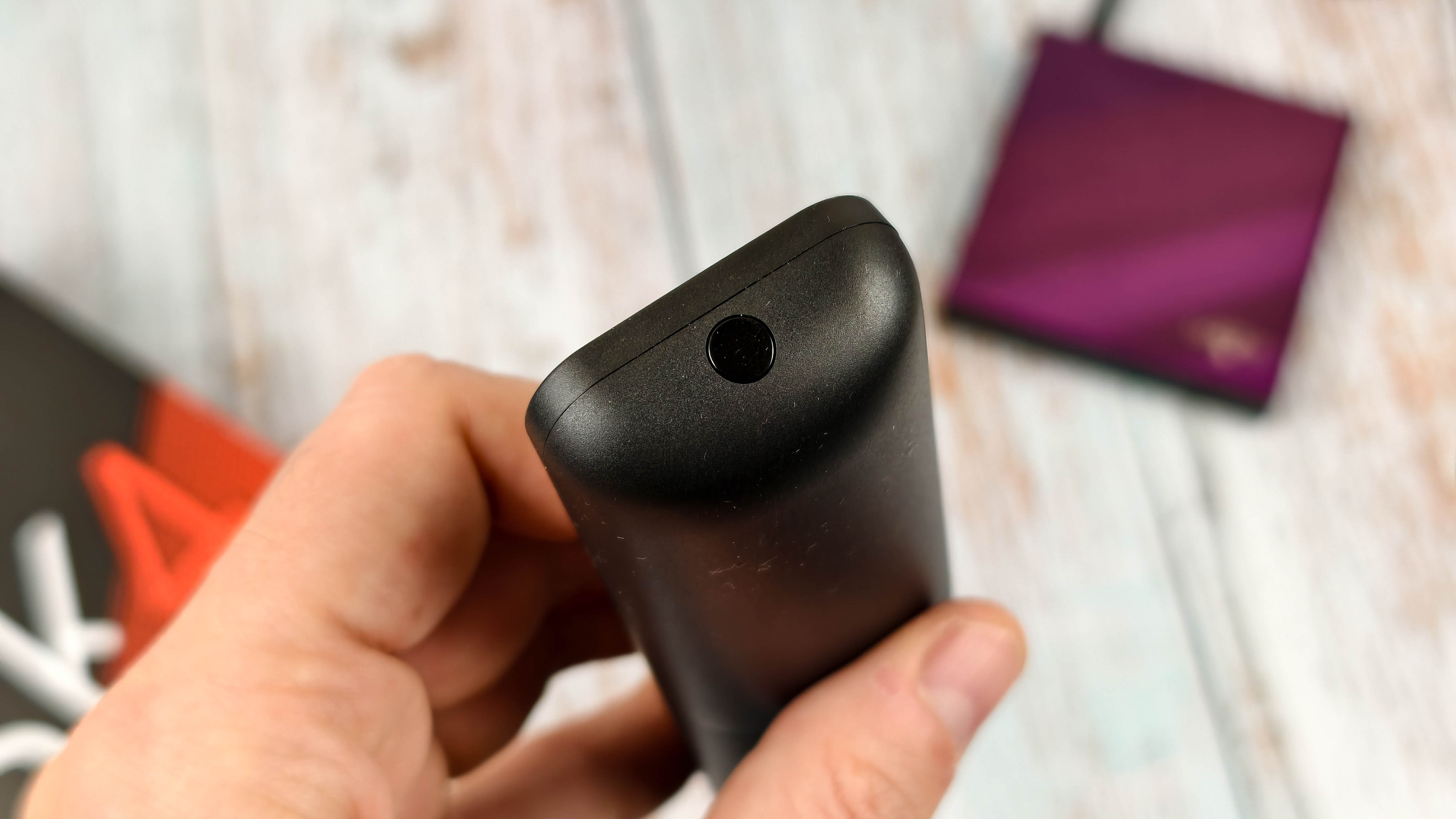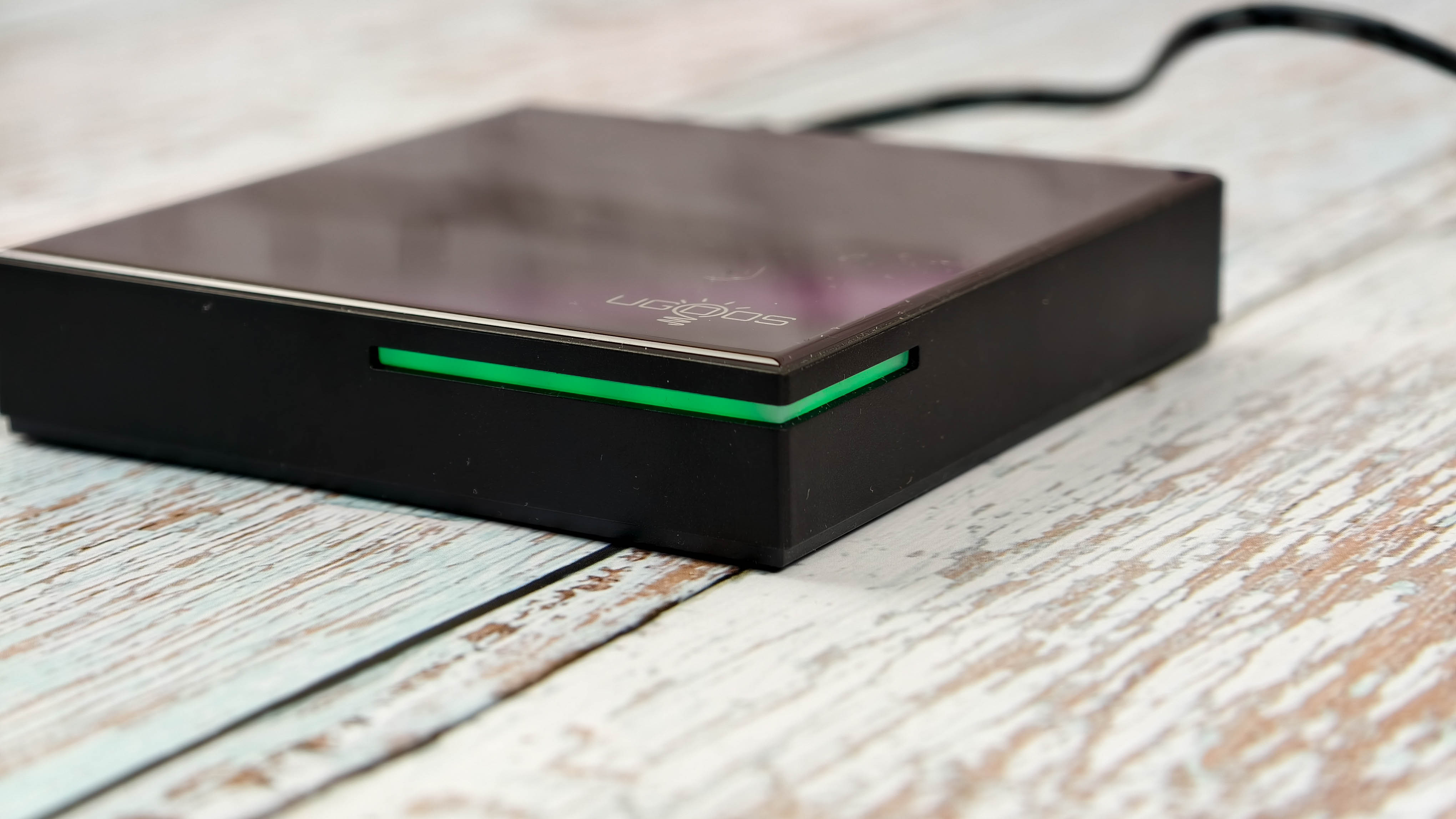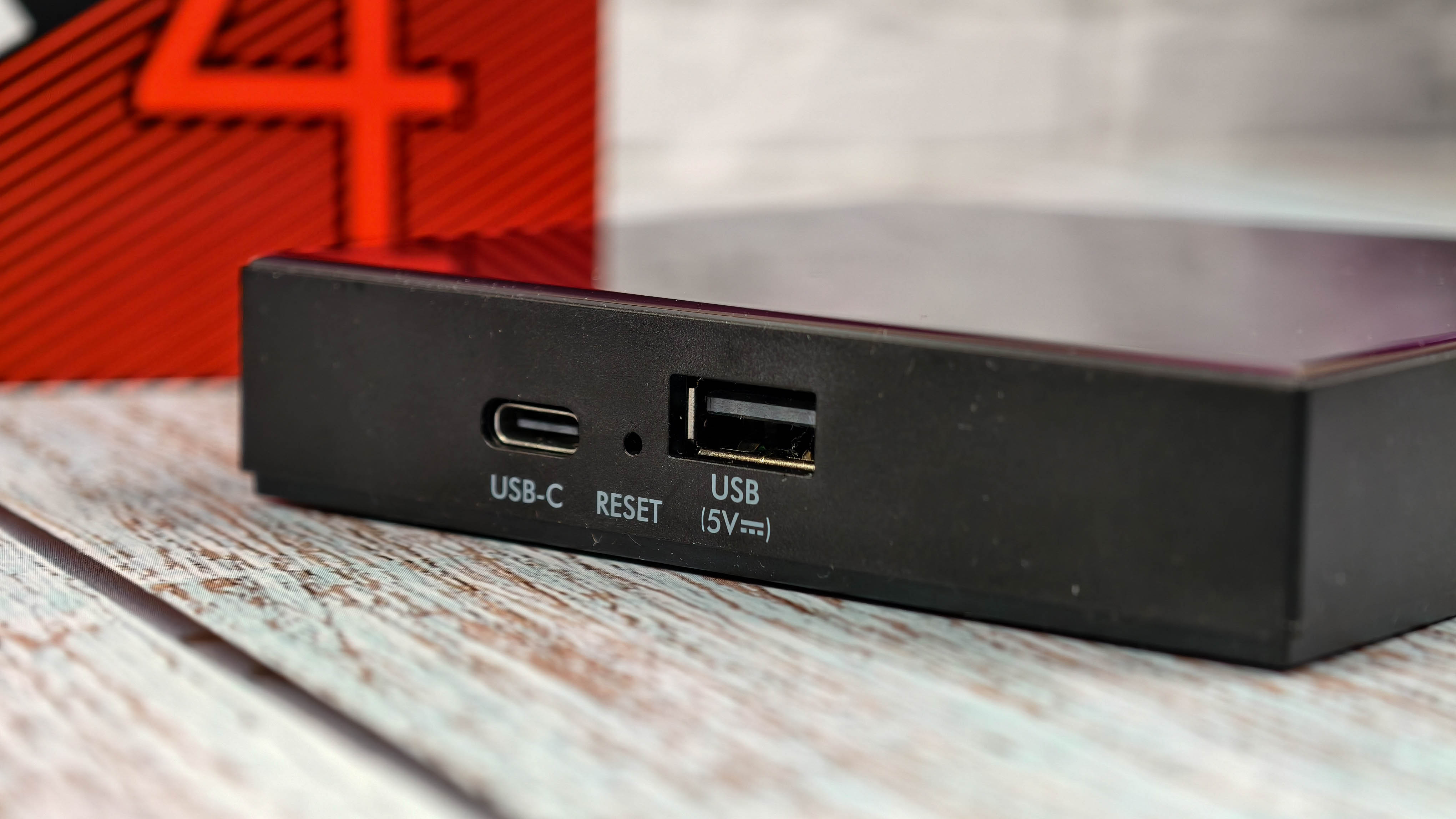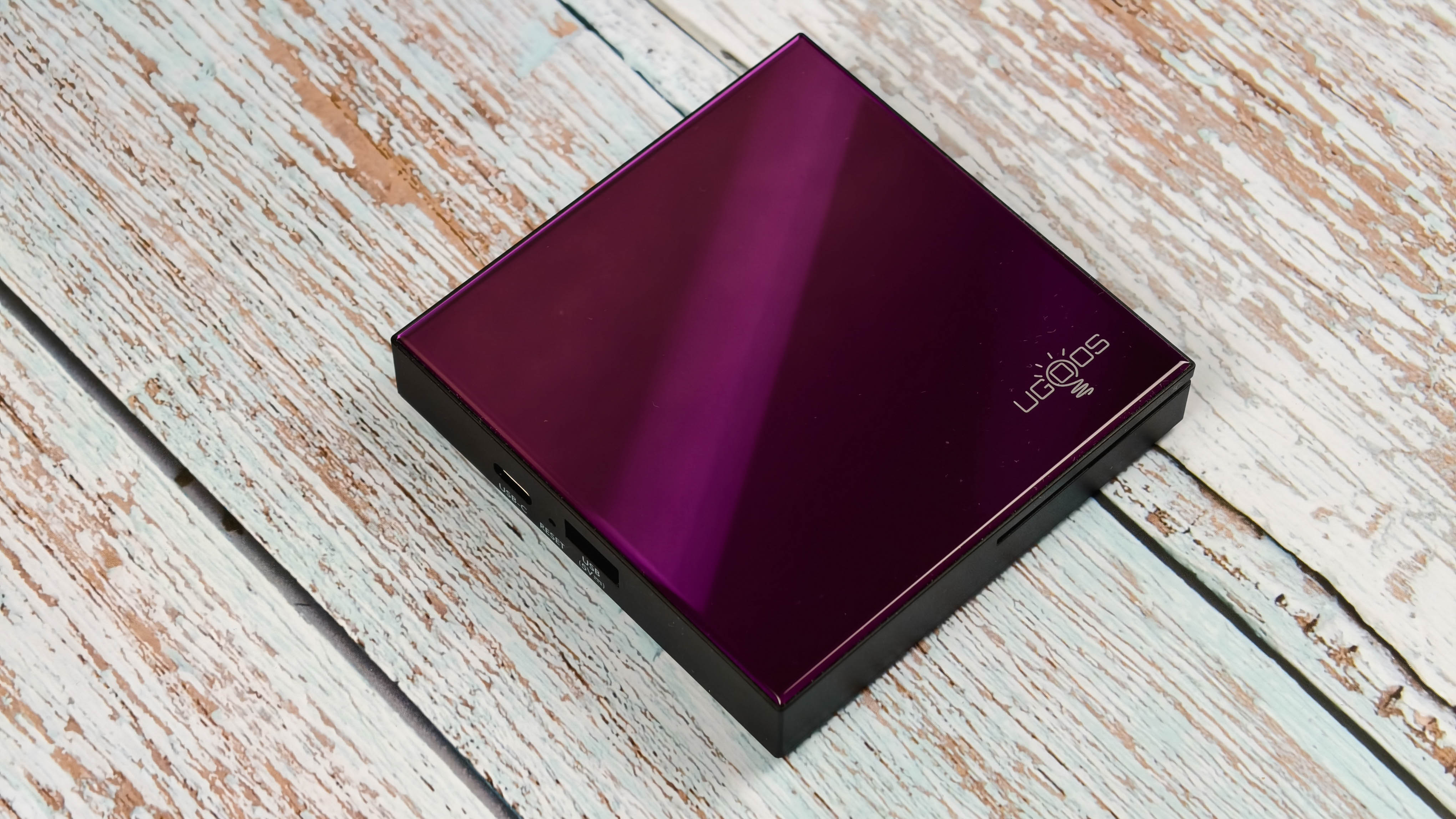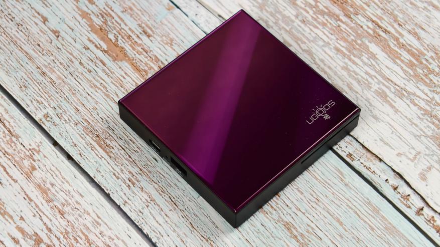 Рассмотрим дизайн и возможности подключений. По внешнему виду это полная копия приставки Ugoos SK2, которая вышла летом 2025 года. Полностью идентичный корпус, за исключением расцветки верхней панели. Если в Ugoos SK2 она синяя, то у UGOOS SK4 фиолетовая (пурпурная) с глянцевым, слегка переливающимся на свету оттенком. Поверхностное покрытие похоже на стекло, есть устойчивость к небольшим царапинам. Возможно это акрил или плексиглас.