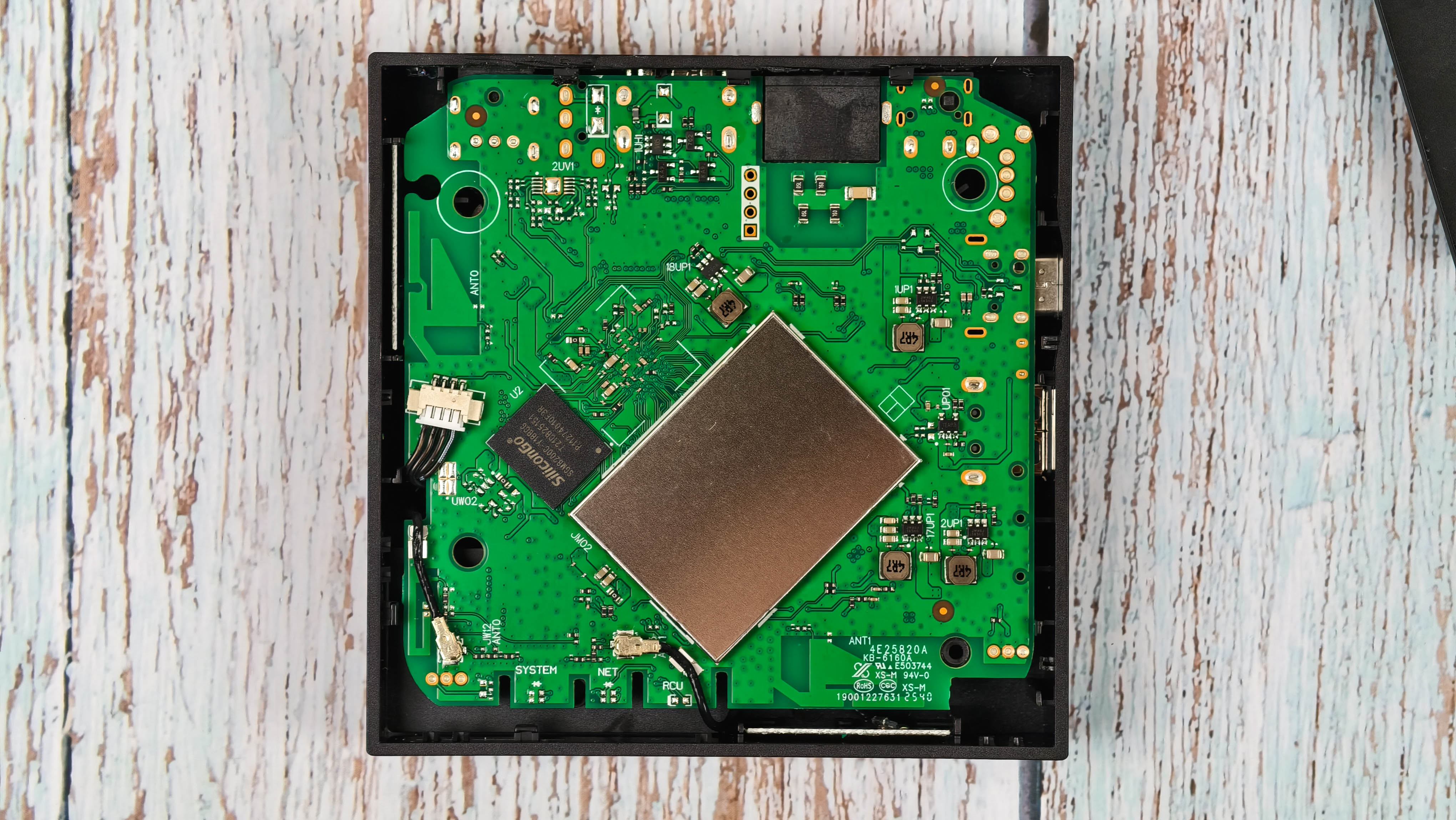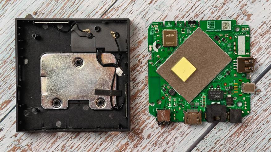 Заглянем внутрь, чтобы оценить систему охлаждения. И сразу хорошая новость: система охлаждения в приставке расположена с правильной стороны, то есть сверху. Таким образом тепло будет естественным образом отводиться в окружающую среду, а не разогревать бокс изнутри. С нижней стороны разместили eMMC накопитель на 64 GB SiliconGo SGM8200C-Y18BCG и оперативную память (под металлическим экраном).