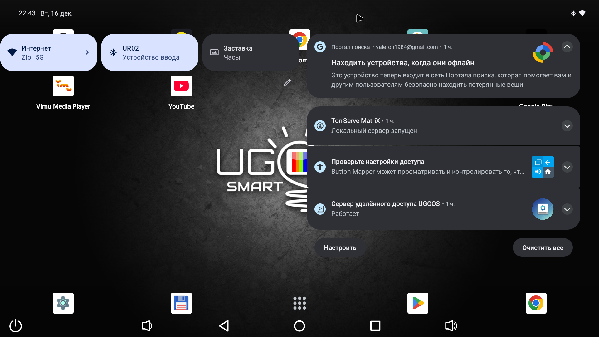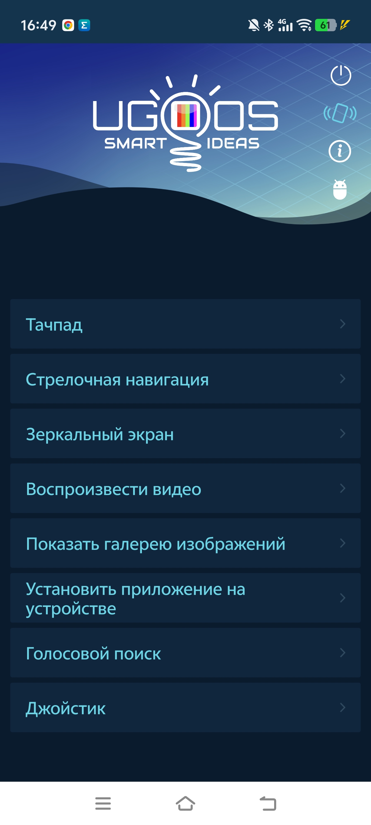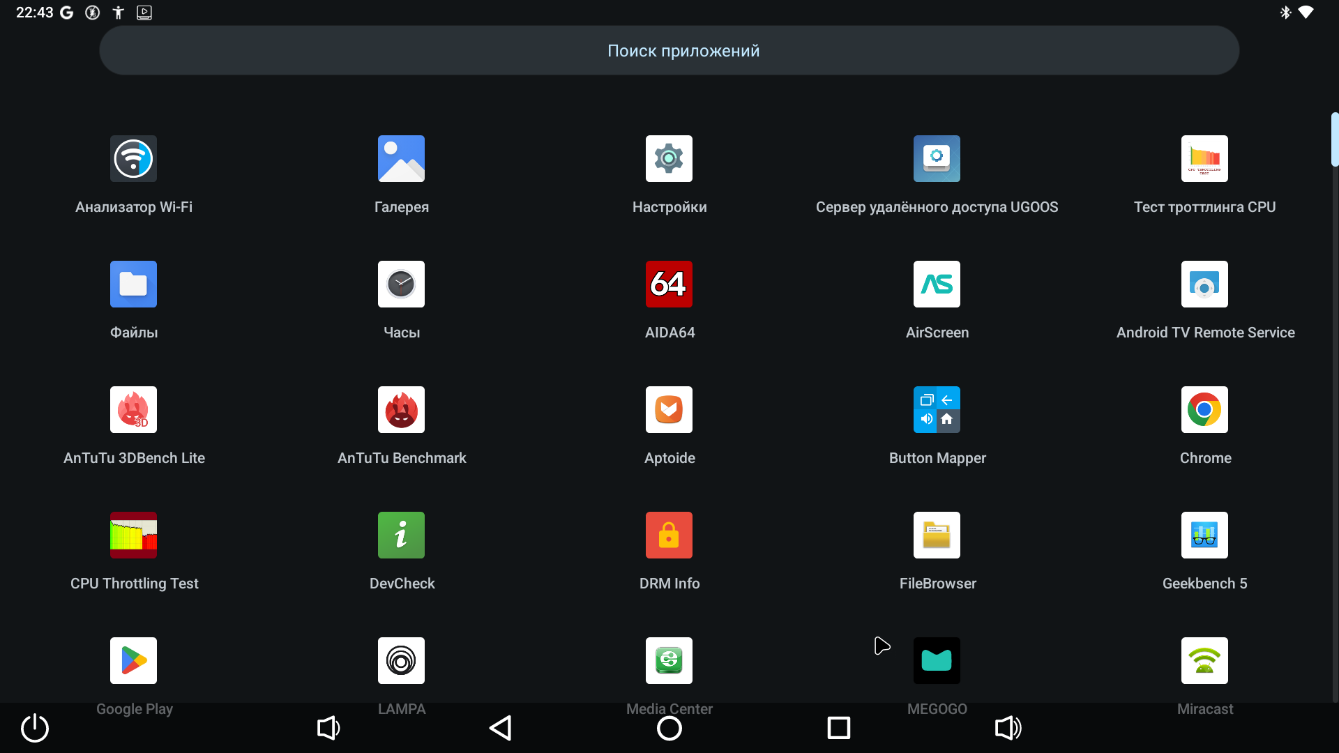 В системе установлены основные приложения, а также некоторые полезные утилиты от Ugoos. Например, приложение Ugoos Remote (пульт). Запускаете приложение на приставке, после чего сканируете qr код на экране и устанавливаете приложение на смартфон. Подключение можно реализовать через WiFi или Bluetooth соединение. Теперь вы можете управлять приставкой прямо со своего смартфона! Есть тачпад, когда вы водите пальцем по области на экране (смысл управления такой же, как и у тачпада ноутбука). Есть виртуальная клавиатура, что будет удобно для быстрого набора текста в соцсетях и мессенджерах. Есть даже виртуальный геймпад для игр. А еще можно посмотреть видео или фото со своего смартфона на большом экране.