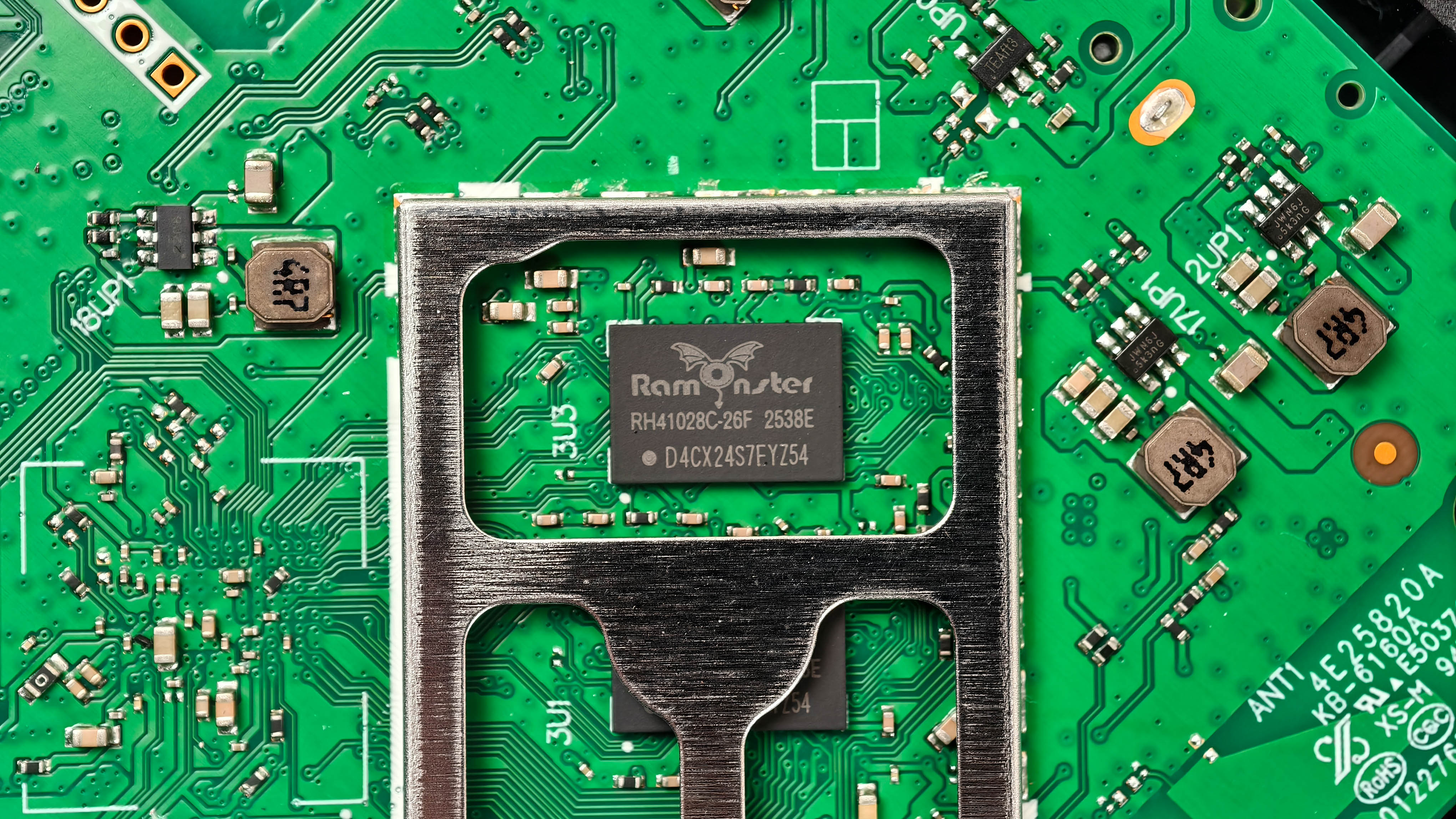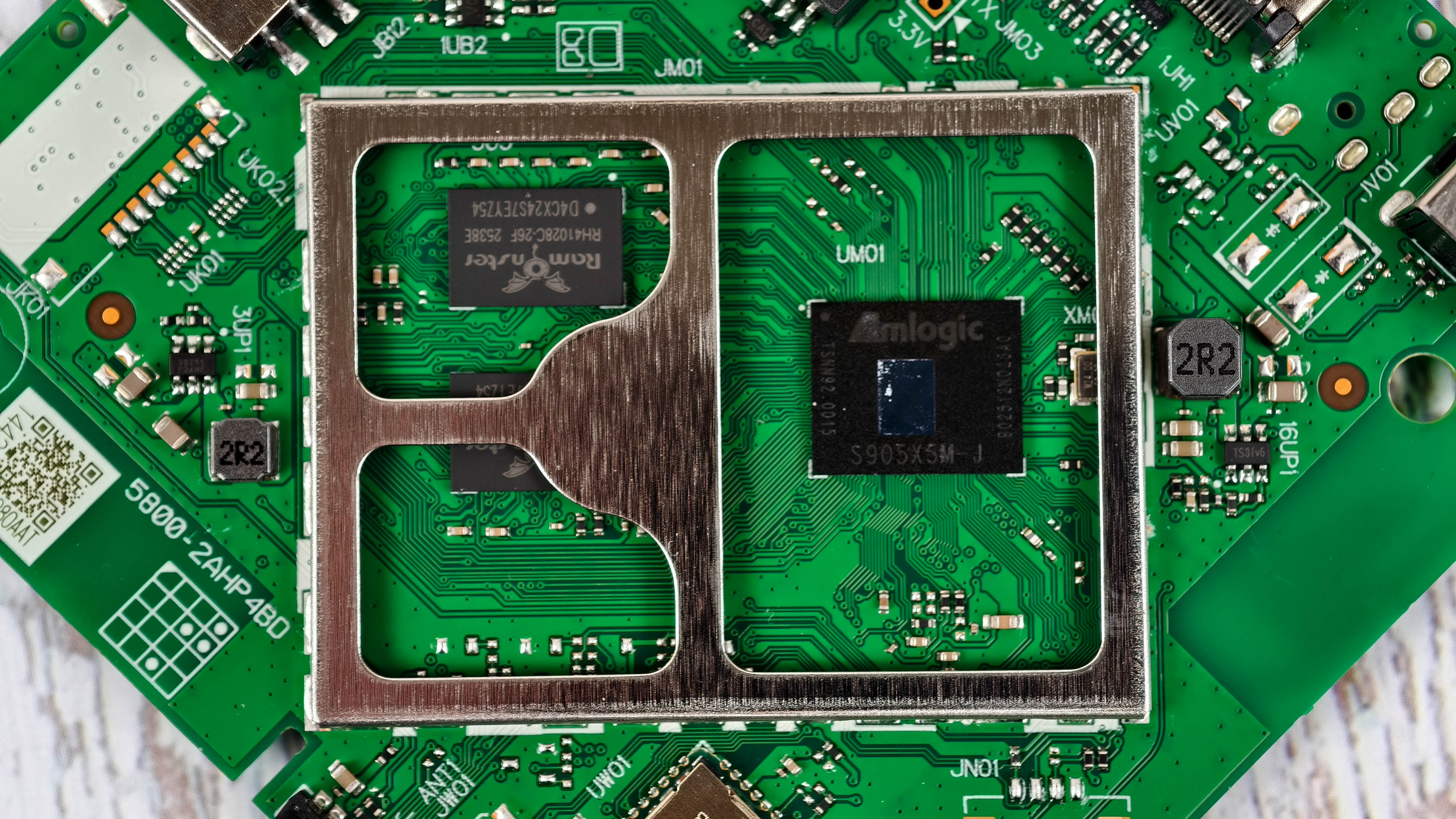 Под экраном процессор Amlogic S905X5M-J. От обычного Amlogic S905X5M этот чип отличается лицензиями на Dolby Vision и Dolby Atmos. Здесь же еще пара чипов оперативной памяти Ramonster.