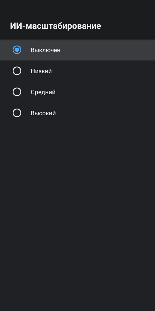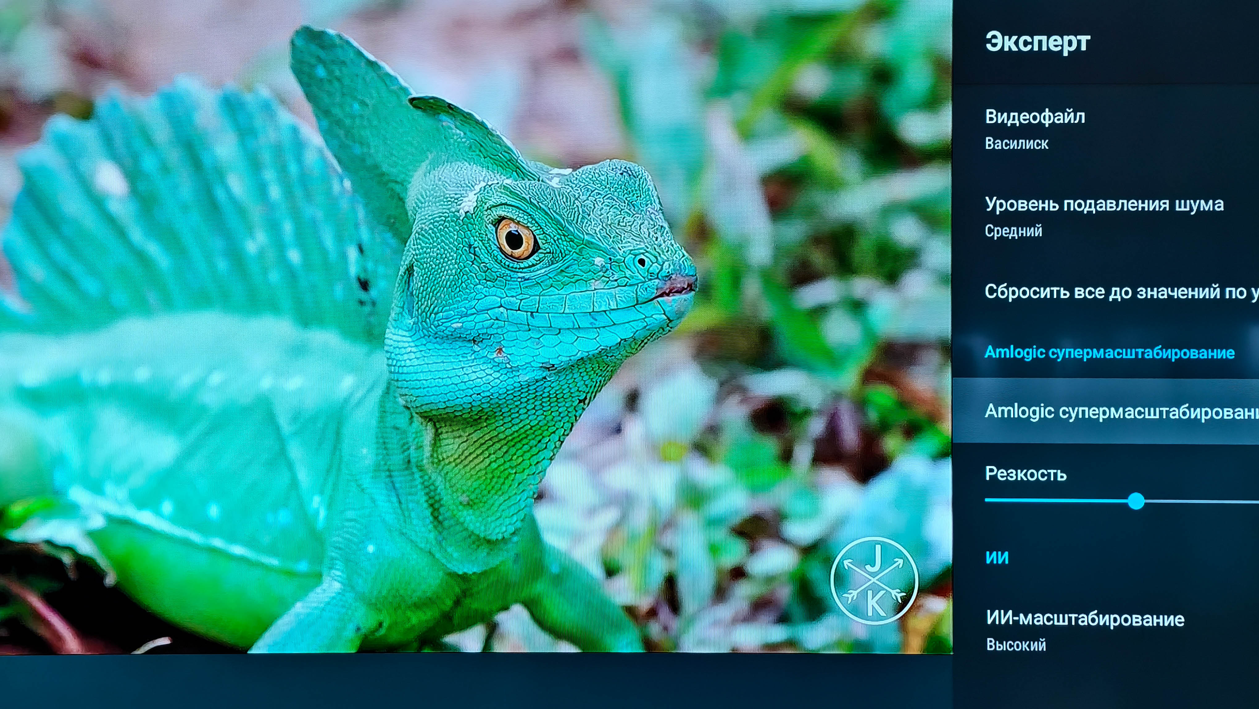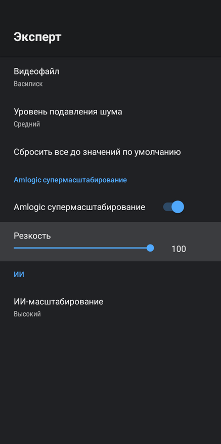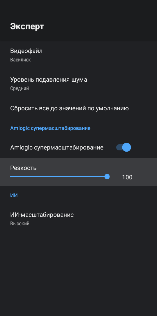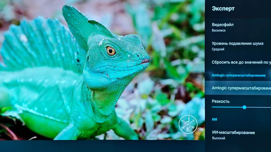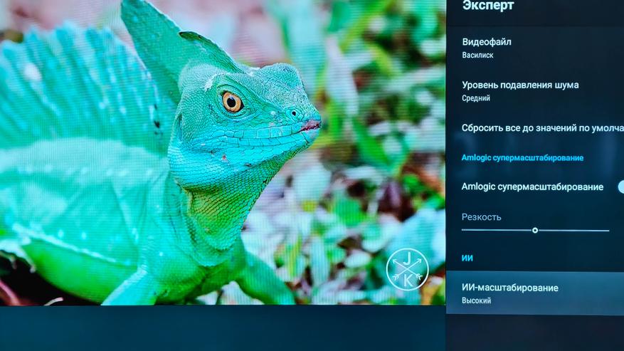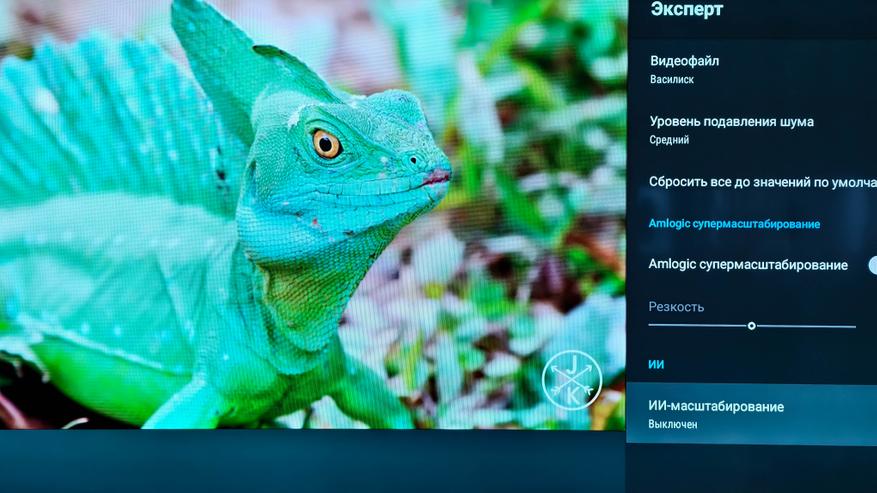 Здесь расположены сразу несколько важных пунктов. Первый это шумоподавление. Я неоднократно слышал от продвинутых пользователей, которые разбираются в качестве изображения, что им не нравится обработка картинки от Amlogic. Мол, у них слишком агрессивное шумоподавление. И вот, пожалуйста, вы можете сами настроить ее интенсивность или даже полностью отключить ее. Второй момент это Amlogic супермасштабирование, функция, которая повышает резкость. По умолчанию не включена и на мой взгляд должна использоваться с осторожностью, так как по факту это банальный «шарпинг». А вот ИИ-масштабирование делает это более реалистичней, увеличивая исходное изображение до качества 4К. Разница между Full HD которое воспроизводится на 4К телевизоре и Full HD c ИИ-масштабированием на том же телевизоре просто колоссальная. После обработки искусственным интеллектом изображение становится детальней, ярче и четче.