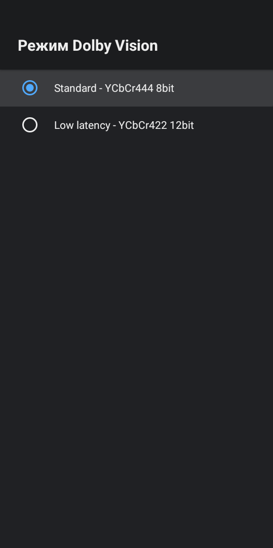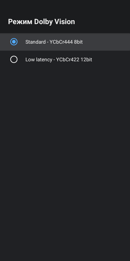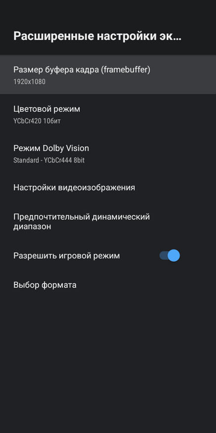 В расширенных настройках есть возможность переключить и настроить цветовой режим, есть поддержка Dolby Vision Low Latency 12 bit. Поддерживается динамический HDR, когда приставка автоматически переключает телевизор в соответствующий режим, в зависимости от воспроизводимого контента. Например, система отображается в SDR, а при воспроизведении фильма в Dolby Vision телевизор переключится в режим Dolby Vision.