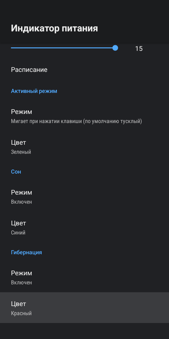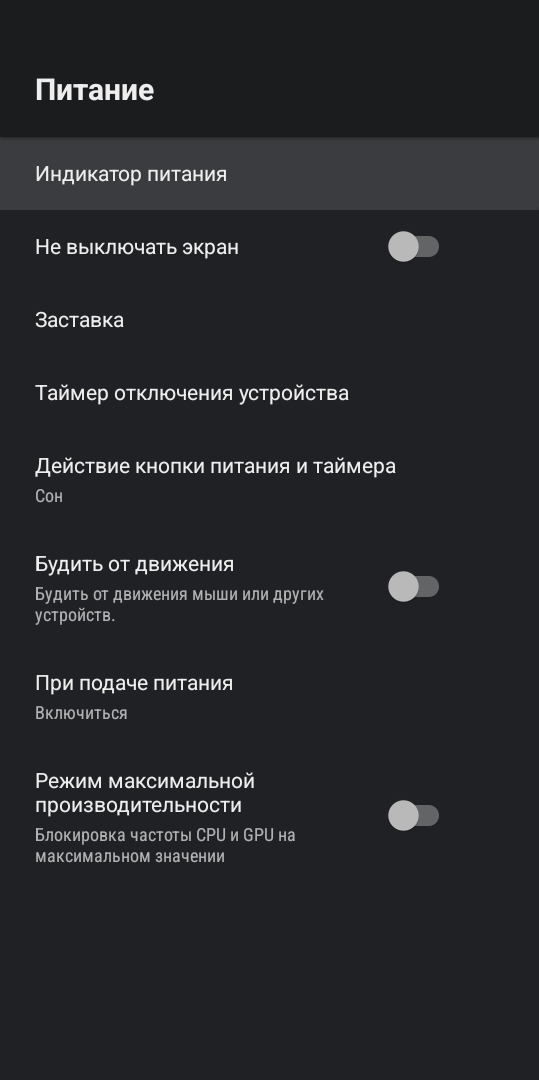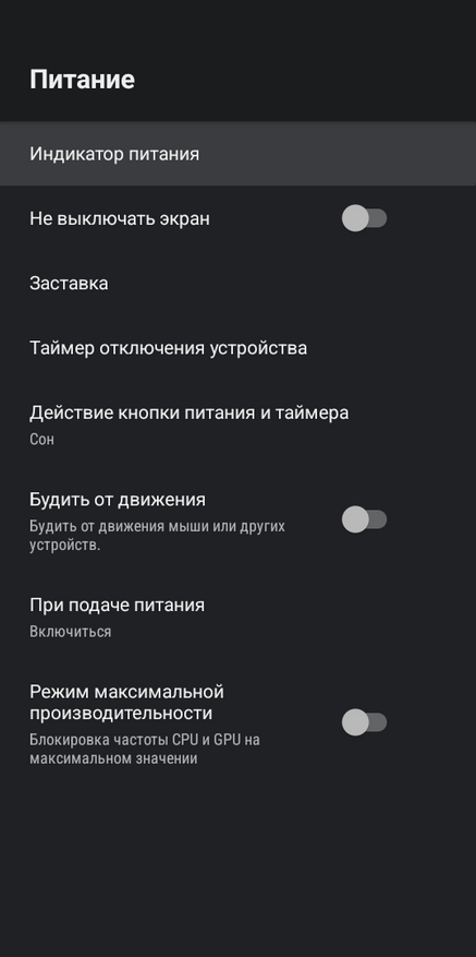 В разделе «питание» можно настроить кнопку выключения, выставить таймер автоматического отключения и задать поведение приставки при возобновлении питания. Кроме того, здесь можно включить режим максимальной производительности при котором частоты процессора будут заблокированы на максимальных частотах. А еще можем настроить тот самый индикатор питания: какого он будет цвета, на что он будет реагировать и что должен показывать в разных состояниях. Можно также отключить его подсветку полностью.