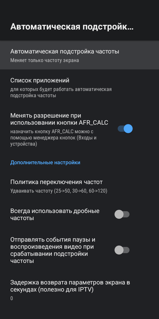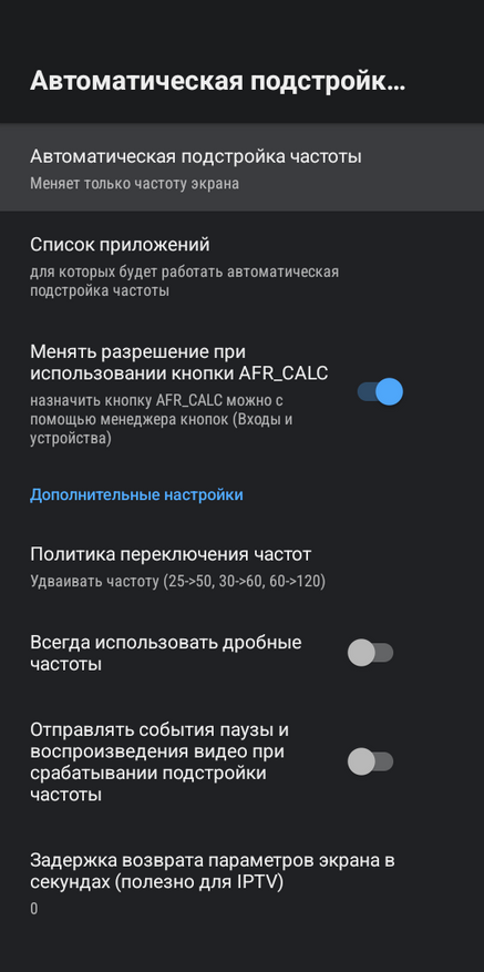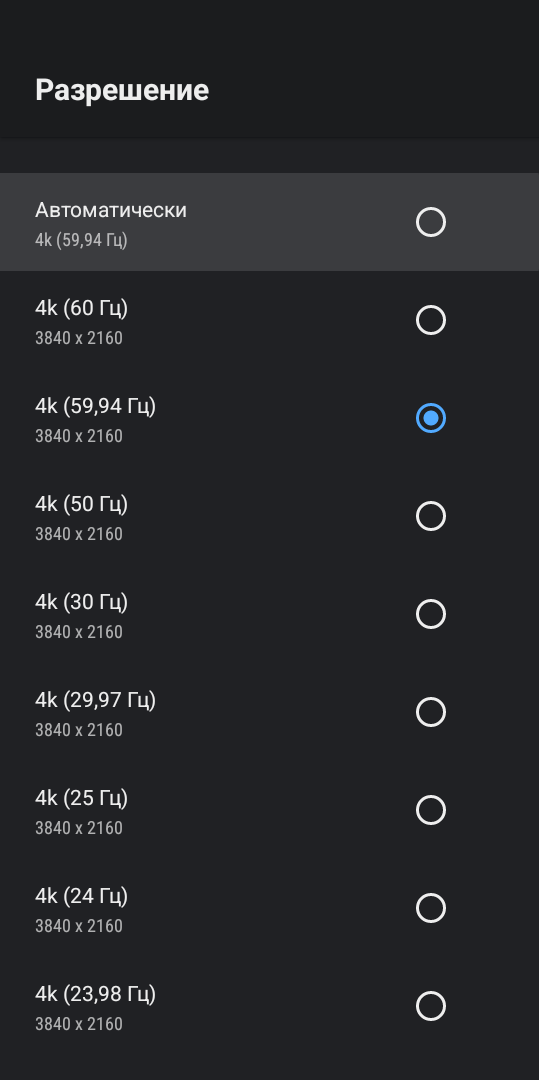 Пройдемся по важным настройкам, которые заодно расскажут нам о возможностях приставки. Поддерживается вывод изображения в разрешении 4К со всеми существующими частотатами (цельными и дробными). Есть полный системный автофреймрейт, который работает в абсолютно любых приложениях и плеерах. Если автофреймрейт нужен только в каких-то определенных приложениях, вы можете их отметить самостоятельно и он будет работать только в них. Кроме того, поддерживается просчет фреймрейта по нажатию на кнопку. Таким образом вы можете синхронизировать частоту только в то время, когда нужно. Допустим при просмотре фильма: нажали кнопку, приставка просчитала фреймрейт и переключила частоту телевизора на ту, что используется в конкретном видео.