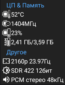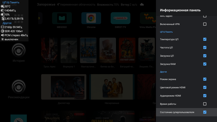 Давайте покажу температуру процессора на конкретных примерах, воспользовавшись информационной панелью. А заодно оценим другие важные показатели. В простое (или при легких задачах, вроде чтения странички в интернет браузере) температура процессора менее 50 градусов. Работающая операционная система съедает 1,85GB оперативной памяти. Также видим, что приставка включила SDR режим и 4К разрешение с частотой 59,94 Hz.