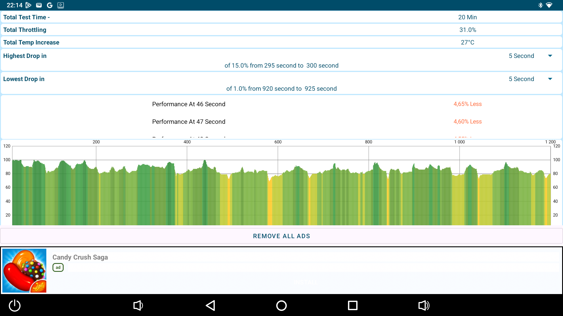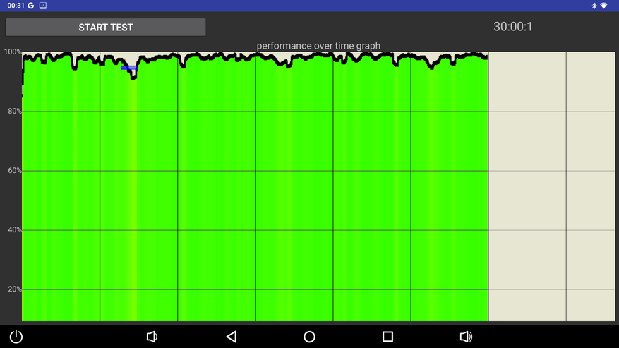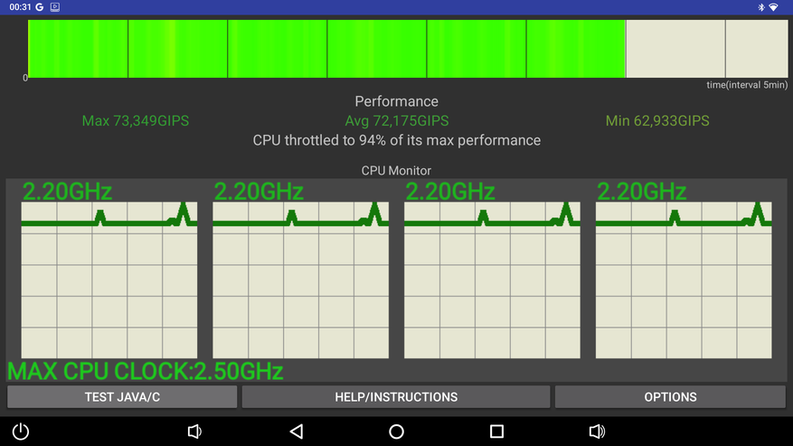 В плане стабильности и охлаждения, как и ожидалось, здесь все в порядке. Троттлинг тест на 100 потоках показал среднюю производительность 72,175 GIPS в среднем и около 6% снижения производительности. Индусы просадили процессор на 31%, но в целом график производительности стабильный, без сильных провалов. При этом в плане температурного режима приставка работает идеальна, даже в стресс тестах температура процессора не поднимается выше 65 градусов, а в обычном использовании температура еще меньше.