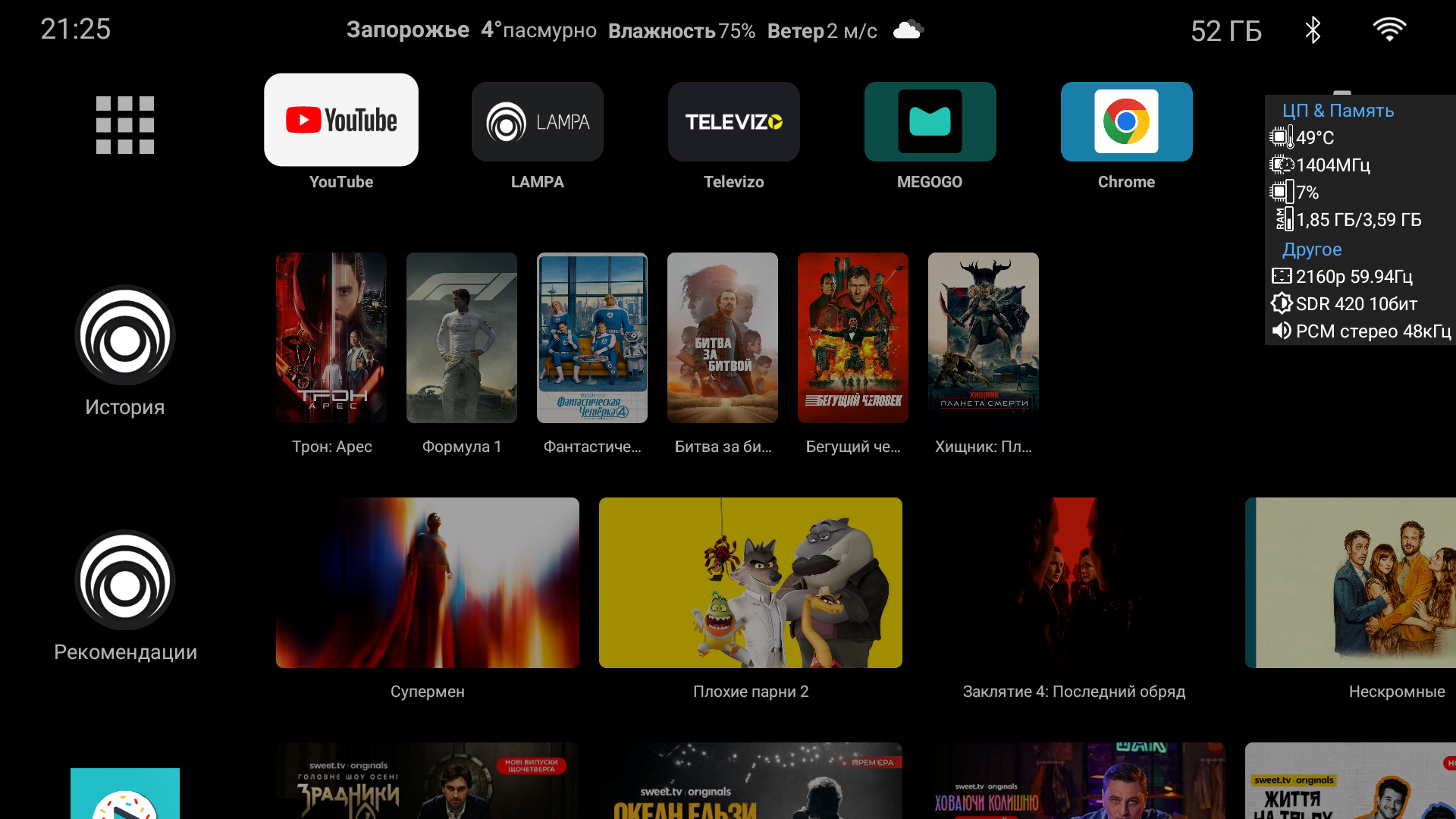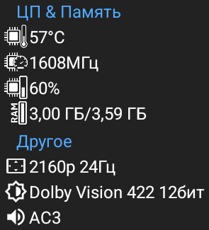 Далее пробую различные виды нагрузок (минимум 30 минут работы). Сперва запускаю тяжелый фильм в 4K Dolby Vision через TorrServe. Температура процессора находится в районе 57 градусов. Обратите внимание, что расход оперативной памяти составил 3GB, то есть уже значительно превысил объем 2GB, который все еще используется во многих сертифицированных боксах. Делайте выводы. Также видим, что приставка переключила телевизор в режим Dolby Vision, а частоту на 24 Hz. Второй скриншот показывает состояние приставки после цикличного воспроизведения ролика в 4К HDR\60 fps с кодеком AV1. Температура 62 градуса и это максимум, что я видел при живом использовании. Третий скриншот — просмотр IPTV и здесь всего 52 градуса. Примерно такая же температура при просмотре фильмов через популярные онлайн кинотеатры.