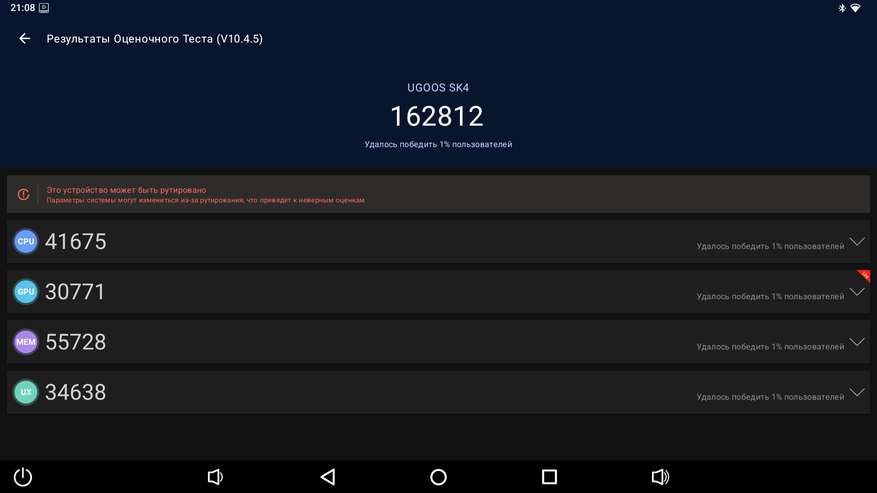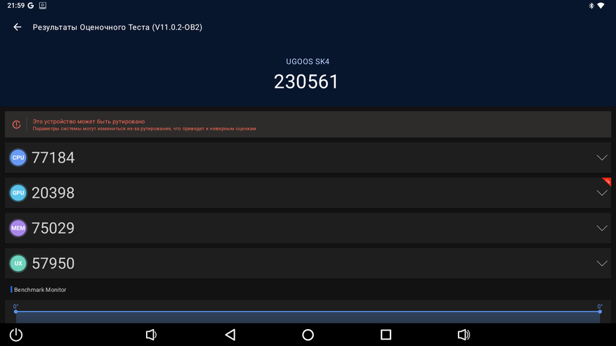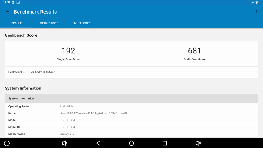 В Antutu 10 приставка набрала 163 000 баллов, что является рекордным показателем среди приставок на Amlogic S905X5M. Например, X96 M200 набирает 152 800 баллов, а Xiaomi TV Box S 3rd Gen всего 140 000 баллов. Такого высокого результата приставке удалось достичь благодаря быстрой памяти и хорошей системе охлаждения, которая позволяет процессору дольше работать на высоких частотах. В Antutu 11 приставка набрала более 230 000 баллов, что также больше, чем у аналогов на этом же чипсете. А конкурирующий с Amlogic в этом же сегменте Realtek RTD1325 набирает лишь 156 000. В Geekbench 5: 192 балла в режиме одного ядра и 681 балл в многоядерном режиме.