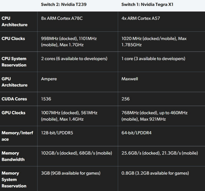 На популярном ресурсе Eurogamer были опубликованы некоторые, ранее неизвестные детали, касающиеся характеристик устройства. В частности стали известны подробности о новом процессоре Nvidia T239. Рассмотреть их и сравнить с процессором пошлого поколения консоли можно по удобной табличке.