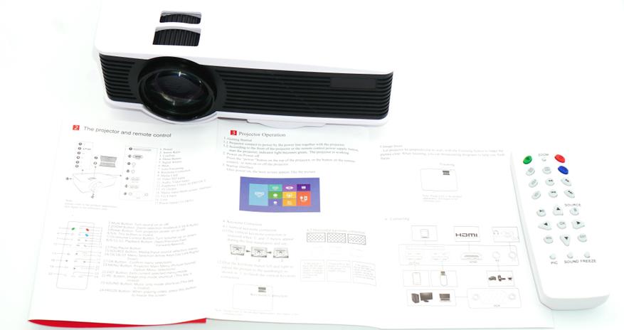 В комплект поставки проектора ProGaga GA9 входит: кабель сетевого питания, AV-адаптер, инструкция, защитная крышка, пульт ДУ.