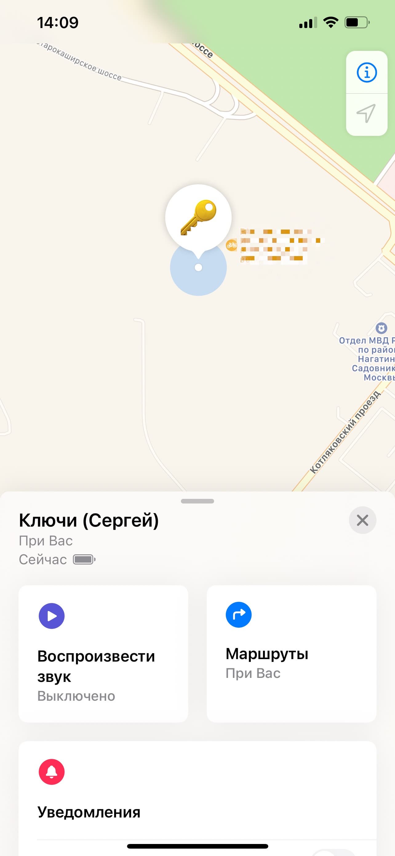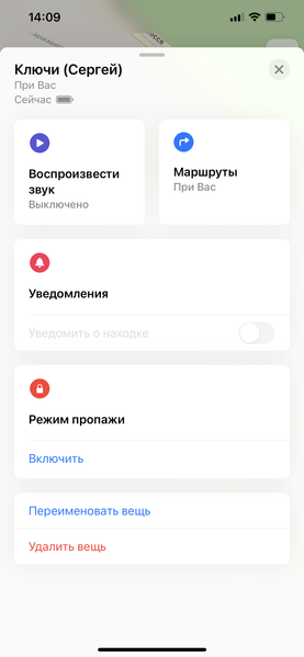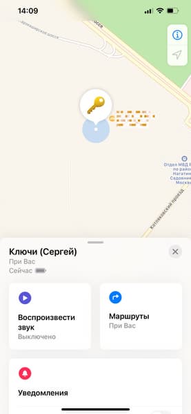 Кликнув на эту вещь, мы можем активировать звуковой сигнал (полезно, если, например, вы бросили где-то в квартире ключи с AirTag и не можете найти) или построить маршрут до AirTag. Также есть уведомления — это нужно в том случае, если вы потеряли вещь в публичном месте и хотите, чтобы вам приходили оповещения, если кто-то с iPhone будет проходить мимо. Да-да, любой обладатель устройства на iOS 14.5 или новее, проходя мимо вашего AirTag, автоматически становится «оповестителем», то есть его iPhone со включенным Bluetooth используется для того, чтобы передать Вам геолокацию AirTag. При этом, Apple утверждает, что вся эта цепочка защищена шифрованием и компания не сохраняет никаких данных ни о положении потерянного AirTag, ни об iPhone, через который идет информация о геолокации, ни об iPhone владельца AirTag.