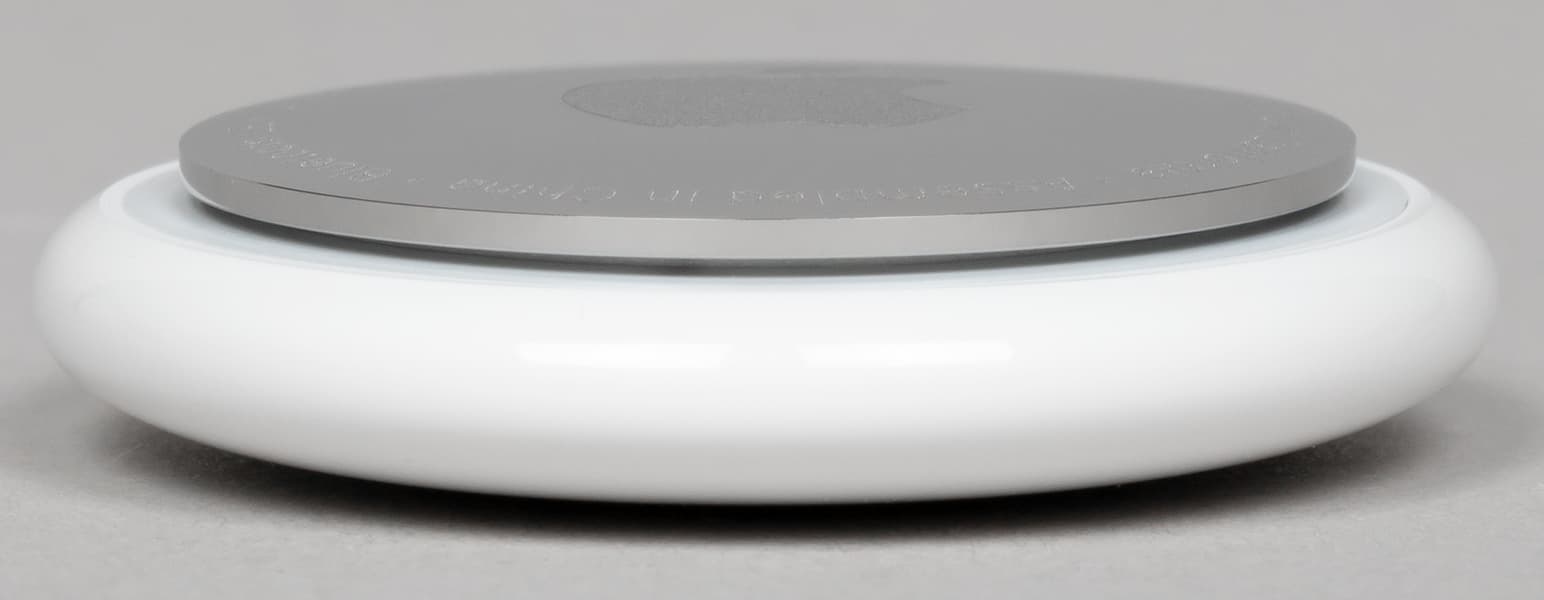 Поверхность основной части AirTag, в которой находится вся электроника, сделана из белого пластика — она чуть выпуклая к центру, а грани плавно закруглены.
