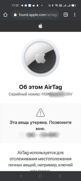 Какие еще сценарии возможны при пропаже? Любой человек, найдя ваш AirTag, может дотронуться до него своим смартфоном, оснащенным NFC-модулем, и у него откроется веб-страница с номером вашего телефона и просьбой позвонить, сообщить о находке. Вот как это выглядит на Android-смартфоне.