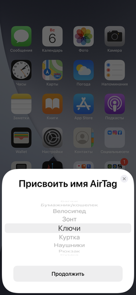 Новому AirTag вы сразу можете присвоить название, указывающее на предмет, к которому он будет подсоединен. Кстати, если iOS/iPadOS у вас не последней версии, то перед подключением будет предложено обновиться, без этого использовать AirTag не получится.