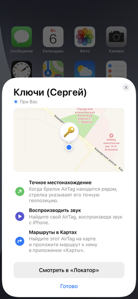 После присвоения имени и нескольких секунд настройки вы видите расположение вашего AirTag на карте, краткое руководство и рекомендацию запустить «Локатор» — приложение, с помощью которого вы будете взаимодействовать с AirTag в дальнейшем.