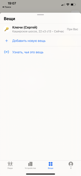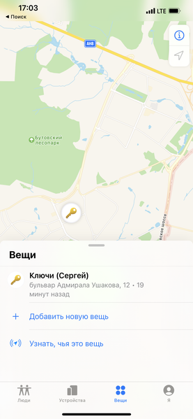 В «Локаторе» ваш AirTag отображается в разделе «Вещи», тогда как iPhone, iPad, MacBook и прочие устройства, подключенные к Apple ID, находятся в «Устройствах».