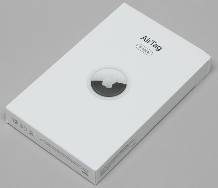 У нас на тестировании был AirTag 4 Pack, то есть комплект из четырех AirTag. Это небольшая плоская коробочка с изображением устройства и названием: оформление предельно минималистично.